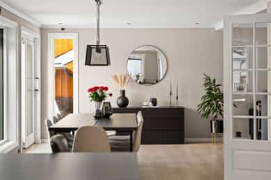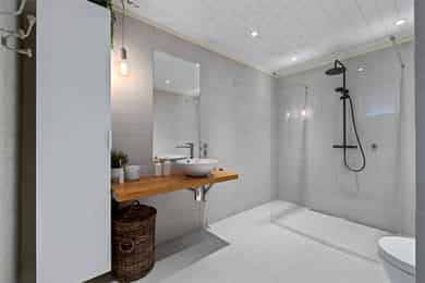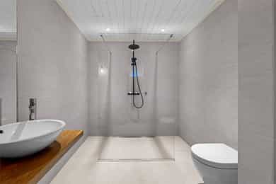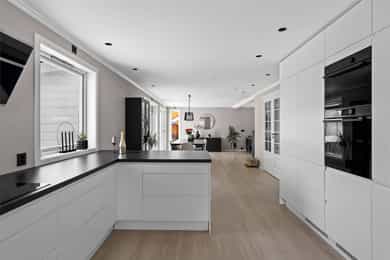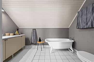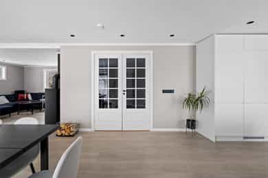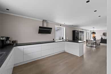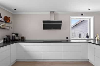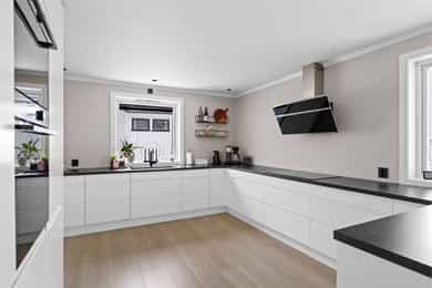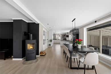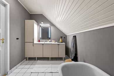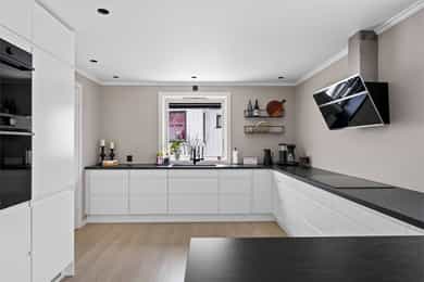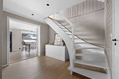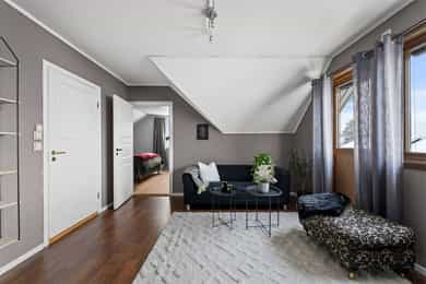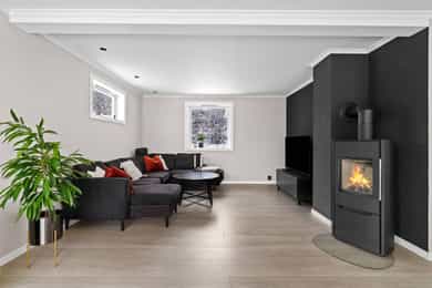 Entre Romslig entre med laminatgulv, lysmalte overflater og plass til åpen garderobeløsning / avheng. Det er også direkte tilgang på innvendig bod. Videre tas man inn i romslig hall med gulvvarme, skyvedørsgarderobe og plass til ønsket møblement under trapp. Stue En tofløyet dør åpner seg mot avdelingen med stue, spisestue og kjøkken. Her er det glatte veggflater i tidsriktig beigetone, stilren laminat på gulv og himling med downlights. Lekre sorte detaljer i EL-matriell og sort kontrastvegg ved TV og peis. Rommet har også gulvvarme. Stuen deles naturlig i flere brukssoner og har store vindusflater og som gir en god romfølelse. Kjøkken Stilrent kjøkken med hvite, glatte fronter, mørkt benkeplate i laminat og alt av integrerte hvitevarer. Kjøkkenet er praktisk utformet for å maksimere skap- og benkplass. Bad I første etasje har man et lekkert helfliset bad fra 2014. Innredning i form av benkeplate med bolleservant, høyskap med hyller og stor dusjsone med regnfallsdusj bak glassvegg. Badet har også downlights i himling, vegghengt toalett og gulvvarme. I andre etasje har man et praktisk sekundærbad. Flislagt gulv, toalett, badekar og innredning med servant. Vaskerom Nyrenovert vaskerom med mørkt våtromsbelegg og lyse veggplater. Opplegg fro vask/tørk og servant. Rommet er klargjort for innredning. Soverom I andre etasje har man to soverom av god størrelse, samt en loftstue med utgang til luftebalkong. Har man behov for 3 soverom - Kan dette enkelt etableres med lettvegg. Hovedsoverom er lysmalt med god plass til dobbeltseng med tilhørende møblement, samt plass til ønsket garderobeløsning. Soverom to har tilsvarende størrelse og er lysmalt med fin kontrastvegg. Teknisk Elanlegg vesentlig oppgradert i perioden 22-25. Sikrinsskap med automatsikringer og skjult ledningsnett. Downlights i de fleste rom, lampepunker i øvrige. Varmtvannsbereder plassert i krypkjeller. Vannrør av kobber, samt rør-i-rør system på det som er fra 22. Avløpsrør av plast. Naturlig ventilasjon. Tilstandsrapport Det er i forbindelse med salget utarbeidet en tilstandsrapport fra bygningssakkyndig. Tilstandsrapporten er en teknisk gjennomgang av boligen med oppdagede avvik. Forhold som har fått TG2 og TG3 må gjennomgås spesielt nøye, da disse indikerer avvik fra normal slitasje og/eller høy alder, med mulig behov for utbedring. Bygningsdeler som har fått TGIU er ikke undersøkt av takstmann. Bygningsdeler som har fått TG2: Veggkonstruksjon: Ingen eller liten luftig i nedkant av kledning, værslitt. Takkonstruksjon: Mangler isolasjon i ene feltet på knevegg. Plast på kaldside. Vinduer: Karmer er slitte og det er sprekker i trevirket. Mer enn halvgått levetid. Se takst. Dører: Glippe mellom vannbrett/dørterskel. Manglende beslag. Balkongdør. Etasjeskille: Høydeforskjell / skjevheter mot dagens krav. Fukt i himling kjeller. Pipe/Ildsted: Mangler takhatt over pipe. Deler av omramming falt av. Ikke dokumentert påkobling til innerrør i pipe. Krypkjeller: Mangler fuktsperre på bakken. Stedvis forhøyet fuktnivå. Innvendig trapp: For stor åpning mellom trinn. Bad: Kvistutslag på panel i himling. Mangler tilluftsventilering/spalte under dør. Vannledning: Mer enn halvgått forventet levetid på delen som er kobber. Fuktsikring/Drenering: Mer enn halvgått forventet levetid. Bygningsdeler som har fått TG3: Nedløp/Beslag: Mer enn halvgått levetid, takrenner har punktvise lekkasjer, ikke tilfredsstillende bortleding av vann og mangler snøfangere. Utvendig trapp: Mangler rekkverk. Overflate: Belegg løsnet i trapperom 2. etasje. Innvendig dør: Mangler utforing og listing på en dør. Vaskerom, gulv: Ikke fall til sluk. Avvik i varmekilde. Avvik i høydeforskjell. Vaskerom, ventilering: Mangler mekanisk avtrekk og tilluft under dør. Bad, 2. etasje: Badet er eldre og bør total renoveres for normal bruk. Varmesentral: Gammel utedel på vegg.