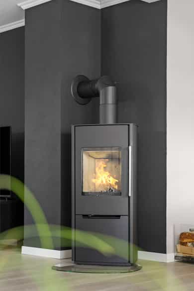 Boligen varmes opp via vedfyring og gulvvarme.