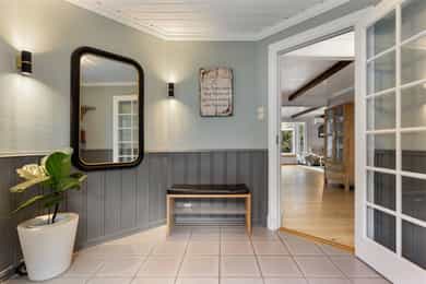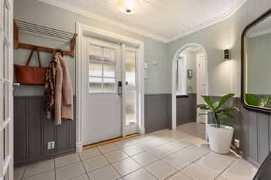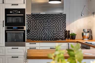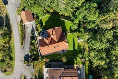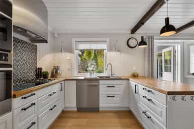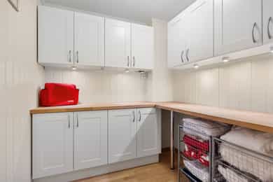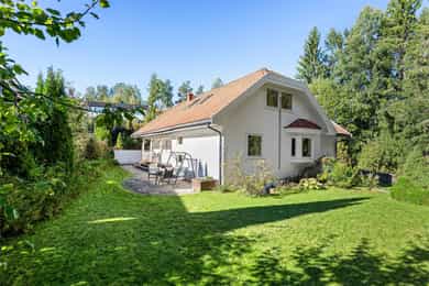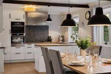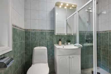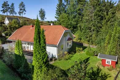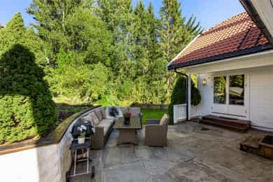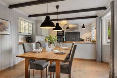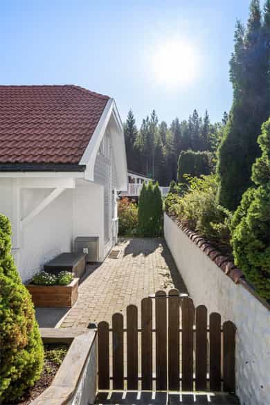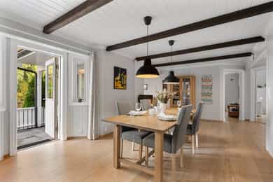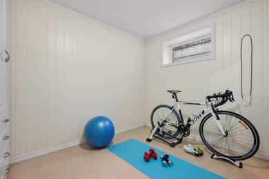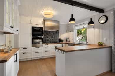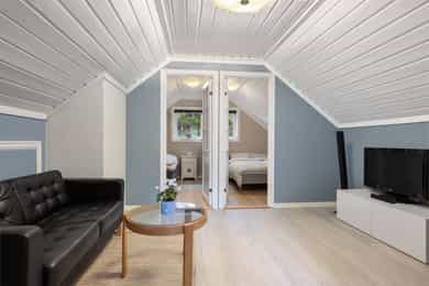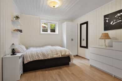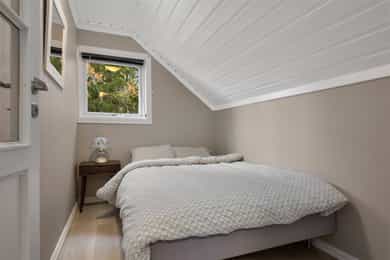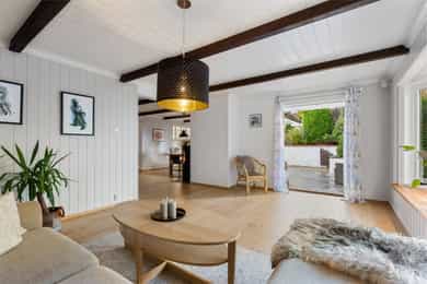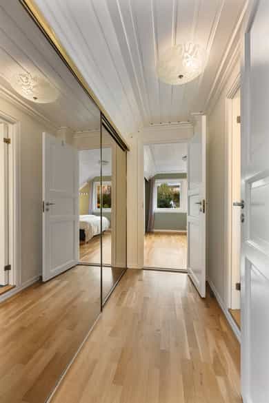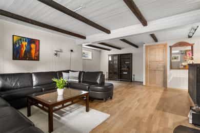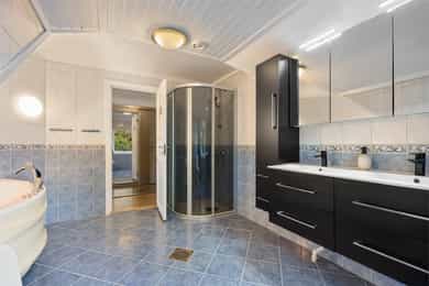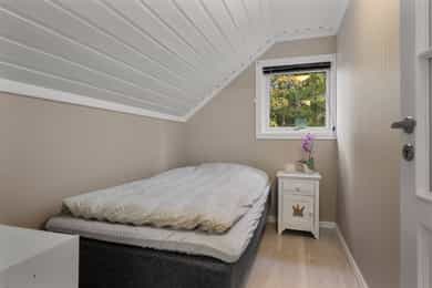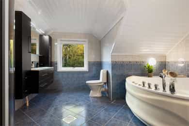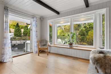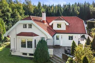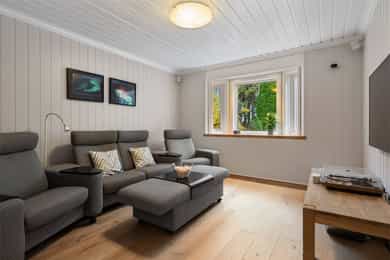Entré Adkomst via entré i 1. etasje. Rommet har flislagt gulv med varme. Veggene har malt tapet kombinert med brystpanel i dempede fargetoner. I himlingen er det malt panel. God plass til oppbevaring av yttertøy og sko. Stue Stuen er lys og innbydende med store vindusflater som slipper inn rikelig med dagslys. Rommet har 1-stavs parkett på gulv, panelplater og malte overflater på veggene, samt malt panel i himlingen med synlige, mørkbeisede bjelker som tilfører karakter. Her er det både gulvvarme og varmepumpe som sikrer behagelig temperatur året gjennom. En tofløyet balkongdør åpner ut mot den nordvest-vendte terrassen belagt med skifer. I stue, spisestue og mediarom er det installert Bose lydanlegg som man kan tilkoble via kabel. Mediarom I tillegg til hovedstuen har boligen et separat mediarom/TV-stue, et ideelt rom for filmkvelder eller avslapping. Rommet har 1-stavs parkett på gulv, panelplater på veggene og malt panel i himlingen. Gulvvarme bidrar til en lun og behagelig temperatur. Kjøkken og spisestue Det er åpen løsning mellom spisestue og kjøkken, noe som skaper en romslig og praktisk sone for både matlaging og måltider. Spisestuen har plass til et stort spisebord, og vedovnen bidrar til lun stemning på kalde dager. I tillegg er det gulvvarme i spisestuen. Kjøkkeninnredningen fra IKEA (2013) har hvite, profilerte 1-speils fronter og overskap med glassfronter med sprosser. Benkeplaten i heltre og har nedfelt sort vaskekum i kompositt med ettgreps, krummet blandebatteri. Over stekesonen er det montert mekanisk avtrekksvifte, og det er opplegg for oppvaskmaskin. Kjøkkenet har integrerte hvitevarer som kjøleskap, mikroovn, stekeovn og induksjonstopp. I tillegg er det koketopp med gassbluss ved siden av induksjonstoppen. Det er ekstern gassbeholder i skap utvendig. Det er etablert komfyrvakt. Bad i 1. etasje Badet i 1. etasje har fliser på gulv og vegger, med dekorativ bordflis som gir et klassisk uttrykk. Himlingen er utført med malt panel, og det er installert gulvvarme for økt komfort. Rommet er utstyrt med mekanisk avtrekk, toalett og dusjnisje med skyvedør, gulvskinne og ettgreps dusjbatteri. Servantskapet har hvite, profilerte 1-speils fronter og servant i hvit kompositt med ettgreps, krummet blandebatteri. Over servanten er det overskap med speilfronter og belysning. Vaskerom Vaskerommet er praktisk utformet med belegg på gulv, malte vegger og malt panel i himlingen. Rommet har mekanisk avtrekk og opplegg for både vaskemaskin og tørketrommel. Innredningen er fra IKEA og består av glatte hvite fronter og hvit laminatbenkeplate med nedfelt skyllekum i børstet stål og ettgreps blandebatteri. Gode oppbevaringsmuligheter med skap og hyller gjør rommet funksjonelt og ryddig. Soverom Boligen er innredet med 5 soverom, med ett i 1. etasje og fire i 2. etasje. Tre av soverommene er av god størrelse med plass til både dobbeltseng og klesoppbevaring. På det ene rommet i 2. etasje er det garderobeskap langs veggen og det er adkomst til kneloft for ytterligere oppbevaring. Mellom hovedsoverommet og gangen til badet er det stor skyvedørsgarderobe. De to soverommene med adkomst fra kontoret er etablert i senere tid, da rommet opprinnelig var en stor loftstue. Disse rommene er rundt 6 kvm hver, se mer under punkt om "Ferdigattest". Det er i tillegg innredet til oppholdsrom/soverom i kjelleretasjen, men dette er ikke godkjent for varig opphold. Kontor og loftstue I 2. etasje er det innredet til loftstue og kontor. Overflatene har 1-stavs laminat på gulv og malt tapet på veggene, mens himlingen er utført i malt panel. Kontor i 2. etasje mangler vinduer. Bad i 2. etasje Badet i 2. etasje har fliser på gulv i blåtoner og mosaikkfliser i dusjsonen. Veggene er flislagt med lyse og blå fliser, samt dekorative bordfliser. Himlingen er utført med malt panel. Rommet har gulvvarme og mekanisk avtrekk. Utstyrt med toalett, dusjhjørne med glassskyvedører, gulvskinne og ettgreps dusjbatteri med ekstra uttak for kaldtvann. Det er boblebad med kran og håndholdt dusjhode. Baderomsinnredningen består av mørke, slette fronter med dobbel servant i hvit keramikk og hvert sitt ettgreps blandebatteri i krom. Over servanten er det overskap med speilfronter og tilhørende høyskap som gir god oppbevaringsplass. Kjellerstue (ikke omsøkt/godkjent for varig opphold) I kjelleretasjen er det innredet til kjellerstue med barløsning. Rommet har 3-stavs parkett på gulv, panelplater på vegger og malt panel i himlingen med dekorative, synlige dragere. Oppvarming skjer via gulvvarme, peis og panelovn. Baren har mørkelaminerte fronter og overskap med omrammede glassfronter med sprosser. Det er benkeplate med nedfelt vaskekum i børstet stål med ettgreps krummet blandebatteri. Det er integrert oppvaskmaskin samt opplegg for kjøleskap eller vinkjøler. Bad i kjelleretasje Boligens tredje bad ligger i kjelleretasjen. Rommet har fliser på gulv og våtromsplater på vegger med fliseimitasjon. Himlingen er utført med Takess-plater. Det er gulvvarme og mekanisk avtrekk. Badet er utstyrt med toalett, dusjhjørne med gulvskinne, glassdører og ettgreps krummet dusjbatteri. Servantskap med hvite, profilfronter og servant i hvit keramikk med ettgreps blandebatteri i rustfritt stål. Over servanten er det overskap med speilfronter. I tillegg er det installert en infrarød badstue som gir rommet en ekstra følelse av velvære. Lagringsplass Boligen har gode lagringsmuligheter med flere boder i kjelleretasjen, samt kneloft i 2. etasje.