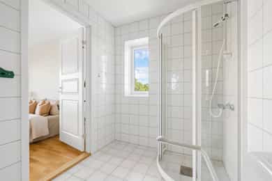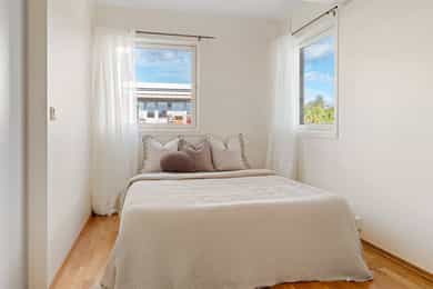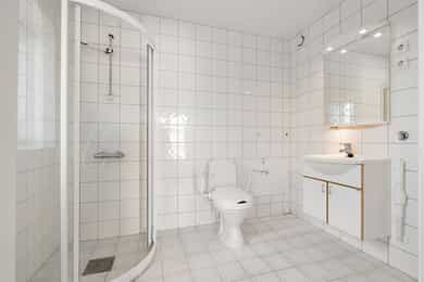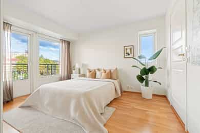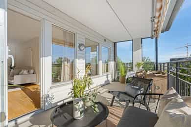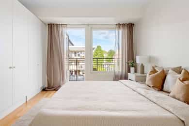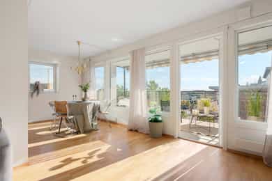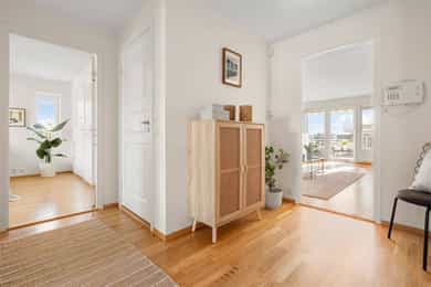 Entré: Velkommen inn! I gangen er det plass til knagger og skohylle for oppbevaring av yttertøy, i tillegg kan det fint innredes med skap eller kommode. Gangen har en sentral plassering i boligen som sikrer god flyt mellom alle rom. Åpen kjøkken- og stueløsning: Flott, tidløst kjøkken fra 2005. Pen innredning med hvite, profilerte fronter og benkeplate i laminat. Nedfelt oppvaskkum i stål med 1 og 1/2 kum samt ettgreps armatur fra Gustavsberg. Innredning med bereder og opplegg for oppvaskmaskin. Det er montert automatisk vannstopper tilknyttet varmtvannsbereder. Frittstående komfyr og avsatt plass til oppvaskmaskin og kjøleskap. Det er godt med både skap- og benkeplass. Kjøkkenet har en skjermet og god plassering i rommet, og i tilknytning til kjøkkenet er det god plass til stort spisebord. Leiligheten har en lys, innbydende og romslig stue med store vindusflater og utgang til balkong. I stuen er det god plass til sofagruppe med tilhørende sofabord og tv-møblement samt spisebord. Stuen har en planløsning som oppleves naturlig og enkel å innrede i ulike soner. Leiligheten ligger i et bygg som ble oppført i 2005, og oppleves velholdt. Overflatene består av tre-stavs eikeparkett og veggene er malt i lyse farger. Gasspeis bidrar til god varme og hyggelig stemning. Fra stuen er det utgang til en sydvestvendt balkong på ca. 15 kvm. Her er det god plass til utemøblement, grill og beplantning. På balkongen er det montert elektrisk markise, belysning og stikkontakt. Det er fritt og åpent utsyn fra balkongen, uten sjenerende innsyn eller gjenboere. Det er utebod på ca. 2 kvm. Hovedsoverom med bad og utgang til balkong: På hovedsoverommet er det god plass til dobbeltseng med tilhørende nattbord på hver side og garderobeskap. Rommet har store vindusflater som sikrer godt med lys og luft. Fra soverommet er det utgang til en nordøstvendt balkong på 5 kvm. Det er direkte adkomst til det ene badet fra soverommet. Tidløst, praktisk bad fra 2005 med flislagte overflater og elektrisk gulvvarme. Badet er utstyrt med dusjhjørne med glassdører på skinner, gulvstående toalett og baderomsinnredning med skap, overlimt servant med ettgreps armatur fra Gustavsberg og speil med spotter på vegg. Mekanisk avtrekk og opplegg for vaskemaskin. Soverom 2: Soverom 2 passer perfekt som barnerom, gjesterom eller hjemmekontor. Her er det god plass til seng, skrivepult og skap. Det er godt med lagringsplass i innvendig bod med adkomst fra soverommet. Bad: Funksjonelt bad med adkomst fra gangen. Badet er fra byggeår, og har flislagte overflater og elektrisk gulvvarme. Innredningen består av gulvstående toalett, dusjhjørne, glassdører på skinner og servant med ettgreps armatur fra Gustavsberg. Mekanisk avtrekk. Overflater: Gulv: 3-stavs eikeparkett og flislagt på badene. Vegger: Malt overflate på vegger og fliser på badene. Himling: Malt overflate i himling. I stuen er takhøyden oppmålt til 2,41 meter.