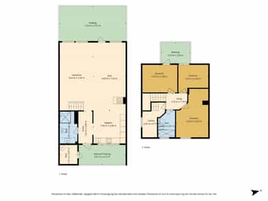 Boligen strekker seg over to etasjer, og inneholder: 1. etasje BRA-i 75 m². Entré, stue, kjøkken og bad. 2. etasje BRA-i 57 m². Gang, bad, 3 soverom og kontor. I tillegg disponeres parkering i garasje, samt en utebod på BRA-e 5 m².