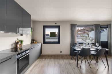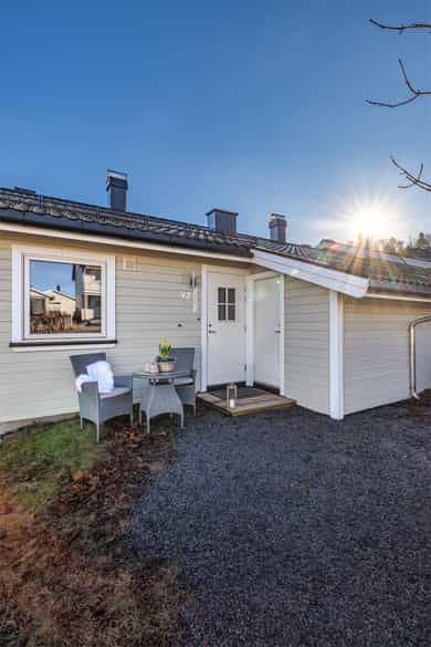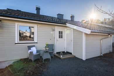 Velkommen til Kleiverudveien 92! En lys, moderne og gjennomført rekkehusleilighet du kan flytte rett inn. Leiligheten har blitt vesentlig oppgradert og fremstår som lys og moderne med smakfulle farge - og materialvalg. Entré og gang: Du ønskes velkommen inn i en lys entré som gir et godt førsteinntrykk av boligen. Gangen knytter alle rommene sammen og har tilgang til en praktisk bod som sikrer gode lagringsmuligheter. Like på utsiden, ved inngangspartiet, har du tilgang på en egen romslig sportsbod med plass til både sykkel og annet hobbyutstyr. Stue og kjøkken: Boligen har en åpen og sosial stue-/kjøkkenløsning. Kjøkkenet er nytt fra 2024 og har en moderne innredning med slette fronter i en behagelig farge, laminat benkeplate og integrerte hvitevarer fra blant annet kvalitetsleverandøren Siemens. Den åpne løsningen mot stuen gjør rommet lyst og innbydende. Stuen har god plass til både sofagruppe og spisestue, og de store vindusflatene slipper inn rikelig med naturlig lys. Fra stuen er det direkte utgang til den solrike terrassen. Terrasse: Boligen har en herlig, sørvendt treterrasse på ca. 16 m² med utgang fra stuen. Terrassen fungerer som en forlengelse av stuen i sommerhalvåret og er en lun og solrik boltreplass. Ved inngangspartiet er det også lagt til rette for en hyggelig uteplass hvor man kan nyte morgenkaffen. Bad/Vaskerom: Badet ble oppgradert i 2024 og er et delikat og funksjonelt rom. Det er utstyrt med baderomsplater på vegger, gulvbelegg med varmevarmekabler, dusjkabinett, moderne baderomsinnredning og opplegg for vaskemaskin. Soverom og Walk-in garderobe: Soverommet er av god størrelse med god plass til dobbeltseng. Høydepunktet er den praktiske og fine walk-in garderoben som ligger i tilknytning til soverommet. Annet: Det er satt inn ny innmat i sikringsskapet (automatsikringer). Det medfølger en fast parkeringsplass i felles garasjerekke. Tilstandsrapport for boligen er vedlagt salgsoppgaven. Se denne for nærmere informasjon om tilstandsgrad. Velkommen!