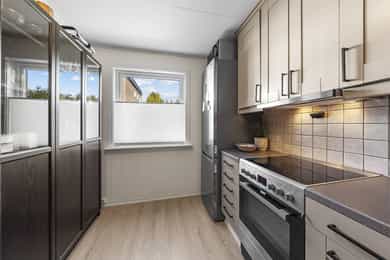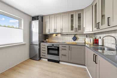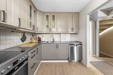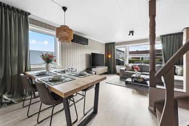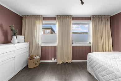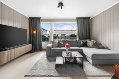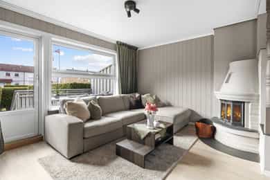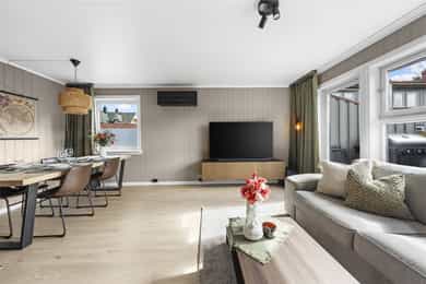 1. etasje: Entré: Fra overbygd inngangsparti, trer du inn i lys entré - velkommen inn! Her er det romslig skyvedørsgarderobe med speilfronter som medfølger i salget. Her er det god plass til sko, jakker og annet yttertøy. Fra gangen har du direkte tilgang til kjøkken, stue og trapp til 2. etasje og kjeller. Stue: Lys og moderne stue med store vindusflater som slipper inn rikelig med dagslys. Stuen er pent pusset opp i moderne farge- og materialvalg. Stuen har plass til sofagruppe og tilhørende møblement, samt spisestue. Fra stue er det utgang til solrik og usjenert terrasse. Det er peisovn og varmepumpe som sørger for god oppvarming. Kjøkken: Innbydende kjøkken med profilerte fronter malt i lun beigefarge, og laminert benkeplate. Takhøy kjøkkeninnredningen tilbyr godt med skap- og benkeplass. Det er avsatt plass til komfyr, oppvaskmaskin og kjøleskap i innredningen. Hvitevarer medfølger i handelen. 2. etasje: Trappegang: Via trapp fra 1. etasje trer du opp i gangen i 2. etasje. Her har du tilgang til alle rom i etasjen. Videre så er det loftsluke med adkomst til loft hvor det er stor gulvplass for oppbevaring Bad: Delikat baderom som er pent pusset opp i 2023. Baderommet er utstyrt med varmekabler i gulv, dobbel heldekkende servant over skuffeinnredning, overliggende speil med belysning, vegghengt skap, vegghengt toalett og dusjhjørne med glassvegg. Soverom: Det er to lyse og gode soverom i etasjen. Begge rom har plass til dobbeltseng, garderobe, kommoder eller annen innredning etter kjøpers ønske. Skyvedørsgarderobe med speilfronter på hovedsoverom Kjeller: Kjellerstue: Rom brukt som kjellerstue (ikke godkjent til varig opphold eller bruksendret hos kommunen). Her er det bra med plass til sofa, tv og annen møblering etter kjøpers ønske. Bod: Praktisk rom til lagring. Her er det opplegg til vaskemaskin hvor mange også bruker rommet som vaskerom
