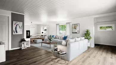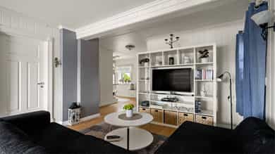 - Nye veggplater og gulv i stue