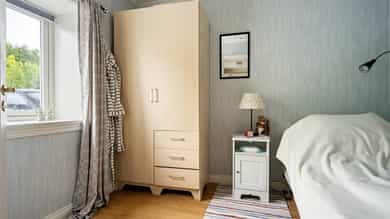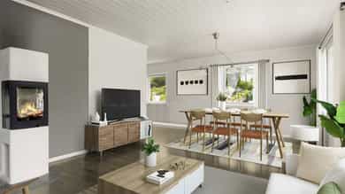 1. etasje Entré og gang Velkommen inn! En praktisk entré og gang med god plass til oppbevaring av yttertøy og sko gir et godt førsteinntrykk. Her er det også direkte adkomst til garasjen – både funksjonelt og komfortabelt i hverdagen. Kjøkken Lyst og trivelig kjøkken med klassiske, profilerte fronter og laminert benkeplate. Det er godt med arbeidsplass og rom for hvitevarer som kjøleskap, komfyr og ventilator. Et kjøkken som innbyr til matlaging og hyggelige måltider. Soverom Etasjen har to fine soverom – begge med praktiske garderobeløsninger. Rommene egner seg godt som hovedsoverom, barnerom eller kontor, alt etter behov. Bad/vaskerom Baderommet er praktisk innredet med fliser på gulvet og tapetserte plater på veggene. Her finner du servant, toalett, dusjkabinett og opplegg for vaskemaskin – alt samlet på ett funksjonelt rom. Garasje Garasjen har plass til én bil og har direkte adkomst til boligens gang – en praktisk løsning, spesielt på regnfulle eller kalde dager. Bod En praktisk bod gir god lagringsplass til det du ikke trenger hver dag. 2. etasje Stue og kjøkken Her finner du en romslig og åpen løsning mellom stue og kjøkken, noe som gir en luftig og sosial atmosfære. Stuen har plass til både sofagruppe, spisebord og TV-møbler – perfekt for både hverdag og gjester. Kjøkkenet har profilerte fronter og laminatbenkeplate, samt plass til kjøleskap, komfyr, platetopp, oppvaskmaskin og kjøkkenventilator. Et hyggelig rom med mange bruksmuligheter. Soverom Det er ett soverom i denne etasjen, med god plass til både seng og garderobeløsning. Perfekt som hovedsoverom eller gjesterom. Bad/vaskerom Flislagt gulv og vegger gir badet et rent og tidløst uttrykk. Rommet er innredet med servant og har god plass til oppbevaring og vaskeløsning. Diverse Taktekking med sementtakstein Takrenner i plast Mursteinspipe med ildsted Varmepumpe fra 2017 Naturlig ventilasjon Varmtvannstank på ca. 200 lite