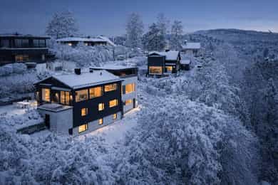 Liomveien 7 har en usjenert beliggenhet i et veletablert, attraktivt og barnevennlig villaområde med kort vei til alt! En perfekt kombinasjon av rolig atmosfære og nærhet til storbyen. Her vil man trives! Eiendommen ble ombygget, totalrenovert og tilbygget i 2022/23, og har materialitet og interiørvalg av høy, tidløs kvalitet. Skaara Arkitekter har stått for prosjektet. I tillegg til å kombinere rå betong med mørkt treverk og blomstertak, har de tilført eiendommen et atrium som skaper gode uterom og spennende gjennomlys, for å fremheve eiendommens viktigste særegenhet – lys- og utsiktsforhold! Boligen er tegnet for en familie med aktiv og sosial livsstil, og har en innholdsrik og familievennlig planløsning. De rause vindusflatene som er vendt mot den fantastiske utsikten, bidrar med rikelig naturlig lys, og skaper en magisk kobling mellom ute- og innerom. Beliggenheten på toppen av et høydedrag, i skrånende terreng, gir en svevende opplevelse og hindrer innsyn. Den opprinnelige boligen fra 50-tallet består av tre plan, og det nye tilbygget består av to plan. Etasjene ligger noe forskjøvet i forhold til hverandre, og skaper en fin helhet med ulike halvplan. Takhøyde på hele 2,70 i tilbyggets øverste etasje gir svært god romfølelse. Via toppetasjen går vi inn i en åpen og lys trappehall, hvor utsikten er det første som møter oss. Her finner vi romslige garderobeskap og en tilliggende bod for ytterligere oppbevaring. Etasjen inneholder videre et luftig allrom bestående av kjøkken/spisestue og stue med peis, hvorav store vindusflater åpner opp mot utsikt i tre himmelretninger. Allrommet har direkte utgang til terrasser og hage. Ett halvplan ned finner vi kontor med utsikt mot atrium som bringer uterommet inn i boligen. Her ligger også gjestetoalett, samt foreldresuite med stort garderoberom og innbydende bad. I boligens underetasje, ett halvplan ned, ligger barneavdelingen med to gode soverom, garderoberom, bad og TV-stue (evt. sov 3). Etasjen har også et vaskerom og tilliggende teknisk rom. Neste halvplan huser treningsrom, grovgarderobe/bod og teknisk rom/smørebod, etasjen har egen inngang. Ytterligere ett nivå ned, men fremdeles over bakkeplan, er det innredet kjellerstue med kjøkken, bad og vaskerom – en ypperlig generasjonsdel eller mulighet for utleie! Flott, lettstelt tomt opparbeidet med terrasser og gressplen, fint tilpasset terrenget. Stor carport med plass til to biler og direkte adkomst til sportsbod, samt plass til flere biler på gårdsplass. Boligen inneholder: Toppetasje: - Hall - Bod - Kjøkken - Spisestue - Stue 1. halvplan: - Kontor - Gjestetoalett - Foreldresuite - Garderoberom - Bad Underetasje: - Soveromsgang - TV-stue (evt. soverom 3) - 2 soverom - Garderoberom - Bad - Vaskerom 2. halvplan: - Treningsrom - Teknisk rom/smørebod - Grovgarderobe/bod Kjeller: - Trappegang - Kjellerstue med kjøkken - Bad - Vaskerom
