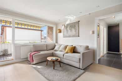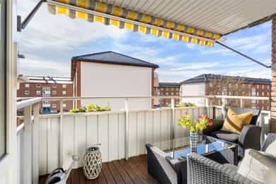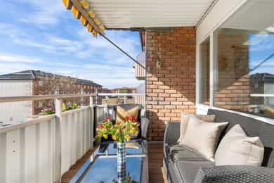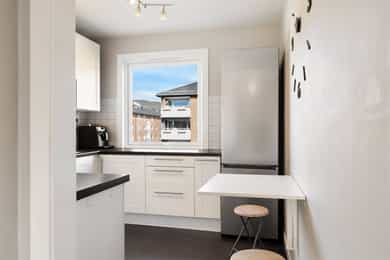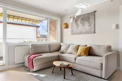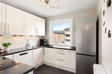 Leilighet beliggende i byggets 3. etasje. Det er adkomst via felles trappeoppgang. Oppgangen har porttelefon. Leiligheten inneholder entré, bad, kjøkken, stue og tre soverom. ENTRÉ: Velkommen inn! Leiligheten har en innbydende entré med flislagt gulv, som gir et praktisk og stilrent uttrykk og skaper et svært godt førsteinntrykk. LYS OG LUFTIG STUE M/UTGANG TIL BALKONG: Stuen fremstår som lys og luftig, med store vindusflater som gir rikelig innslipp av naturlig lys og bidrar til en behagelig romfølelse. Den gode planløsningen gir fleksible møbleringsmuligheter, med plass til både sofagruppe, TV-møblement og spisebord med tilhørende stoler. Gulvet er belagt med flott laminat fra 2023, og vegger og overflater er malt i delikate, moderne fargetoner samme år, noe som gir et helhetlig og tidsriktig uttrykk. Stuen utgjør et ideelt utgangspunkt for å sette sitt personlige preg og skape et hjem tilpasset egne ønsker og behov. Fra stuen er det utgang til en herlig balkong på ca. 7 kvm med svært gode solforhold. I vår- og sommerhalvåret blir balkongen en naturlig forlengelse av stuen, perfekt for hyggelige stunder med familie og venner. Her kan du enkelt skape en koselig uteoase med utemøbler, beplantning og en gassgrill. Boligen ligger i et barnevennlig område, med park rett nedenfor balkongen hvor barn kan leke fritt og enkelt følges med på fra boligen. SEPARAT KJØKKEN: Moderne kjøkken med rikelig skap- og benkeplass. Kjøkkenet har profilerte fronter, kombinert med en slitesterk laminat benkeplate. Integrert oppvaskkum med ettgreps blandebatteri. Kjøkkenet er utstyrt med integrerte hvitevarer, herunder stekeovn og platetopp. Over platetoppen er det montert kjøkkenventilator med kullfilter, som sikrer effektiv ventilasjon. HOVEDSOVEROM: Soverommet er romslig, med plass til dobbeltseng, nattbord og tilhørende møbler. De lune og lyse fargevalgene på veggene, sammen med store vindusflater, skaper en lys og behagelig atmosfære. Rommet har også rikelig med oppbevaringsplass i en romslig skyvedørsgarderobe. SOVEROM 2 og 3: Soverommene er romslige og har plass til både seng og øvrige møbler. De er allsidige rom som passer perfekt som barnerom, gjesterom eller hjemmekontor, tilpasset dine behov. Begge soverommene har gode oppbevaringsmuligheter i garderobeskap. BADEROM: Pent, flislagt baderom med gulvvarme. Badet består av servant med skap, speil og belysning, veggmontert toalett og dusjhjørne med vegg/dør i herdet glass. Det er opplegg for vaskemaskin. Våtrommet har naturlig avtrekk via ventil i taket, og tilluft gjennom spalte i nedkant av døren. OPPBEVARING: Leiligheten disponerer en bod i kjeller på ca. 3 kvm, samt en romslig loftsbod ( ca. 2,5 x 3,5 m) med takhøyde på ca. 1,90 ved inngang. Boden har skråtak, noe som gir avtagende takhøyde innover, men tilbyr likevel gode oppbevaringsmuligheter. Det gjøres særskilt oppmerksom på at bod som er medtatt som BRA-e og i totalt BRA ligger på fellesareal, men disponeres av denne leiligheten. Det finnes også fellesarealer med gode oppbevaringsmuligheter for blant annet sykler, bildekk og lignende, samt plass til eksempelvis skiboks ved behov. ØVRIG INFORMASJON: Entrédør: Entrédør med dørkikkert, brann og lydklassifisert. B30/35dB. Vinduer: Malte trevinduer med 3-lags isolerglass. Innerdører: Innvendig profilerte, hvitmalte lettdører i trekarm. Skyvedør på det ene soverommet. Innerdørene ble byttet i 2023, bortsett fra baderomsdøren. Balkongdør: Balkongdør er i malt tre med 3-lags glass. Ventilasjon: Naturlig ventilasjon i boligen med veggventiler/vindusventiler for tilluft og avtrekk på våtrom/kjøkken. Elektrisk anlegg: Automatsikringer i sikringsskap med hovedsikring/lastbryter på 32 A. Sikringsskapet er montert i trappeløpet. Oppvarming: Oppvarming via radiatorer tilknyttet sameiets sentralfyringsanlegg, med plassering under vinduer i oppholdsrom for optimal varmefordeling. Badet er utstyrt med elektriske varmekabler i gulv.