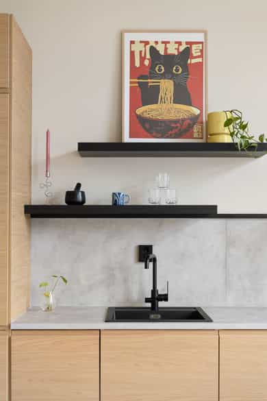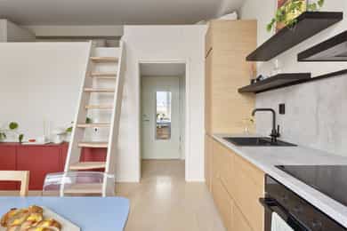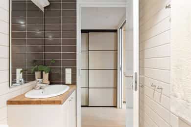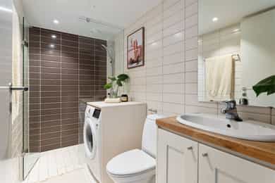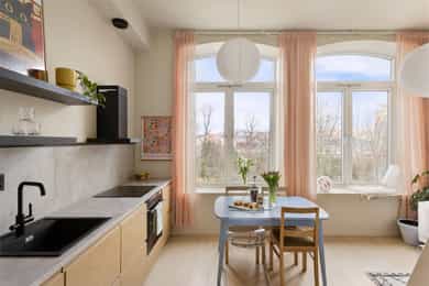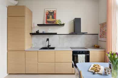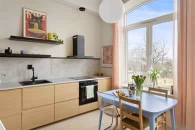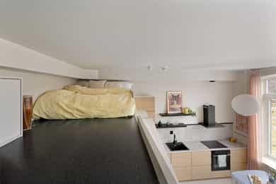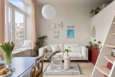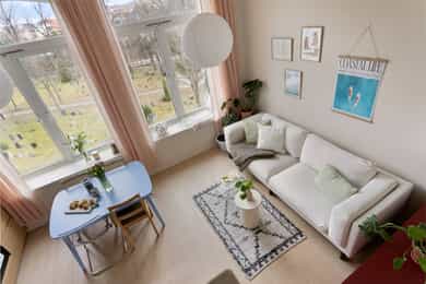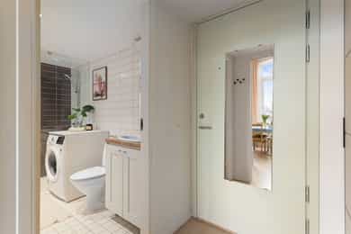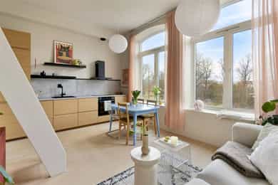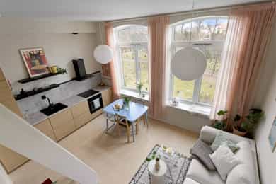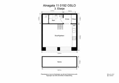 Leiligheten ligger i 3. etasje og inneholder entré, bad, og åpen stue-/kjøkkenløsning med hem. Hems er etablert som tilleggsareal med begrenset takhøyde. Takhøyde er målt til 3,23 meter Takhøyde på hems er målt til 0,93 meter Hems er målt til ca 7,62 kvm. Entre Innbydende entré som gir et godt førsteinntrykk av boligen. Det er god plass til å henge fra seg yttertøy og sko i stor skyvedørsgarderobe. I følge tidligere salgsoppgave er det gulvvarme i entré, stue/kjøkken og bad. Stue med hems Lys og delikat stue med god plass til sofa, spisebord og TV-møbler. Rommet har en fantastisk takhøyde på over 3 meter som gir en luftig romfølelse. Parkett på gulv, slipt 2025. Store, vakre vindusflater slipper inn rikelig med naturlig lys. Fra stuen er det tilgang til en praktisk hems med ca 8 kvm gulvareal. Kjøkken Lekkert kjøkken fra 2025 med glatte fronter i trefinish og laminat benkeplate ,samt backsplash på vegg med list og ledlys over. Nedfelt svart kum med armatur. Kjøkkenet har integrerte og frittstående hvitevarer bestående av kjøleskap m/fryser, oppvaskmaskin, stekeovn, og platetopp med ventilator med kullfilter. Bad Tidsløst bad av god størrelse utført med flislagte overflater, elektriske varmekabler, dusjløsning, toalett og opplegg for vaskemaskin. Badet fremstår som modernisert og antas oppgradert rundt 2007. Det er mekanisk avtrekk.