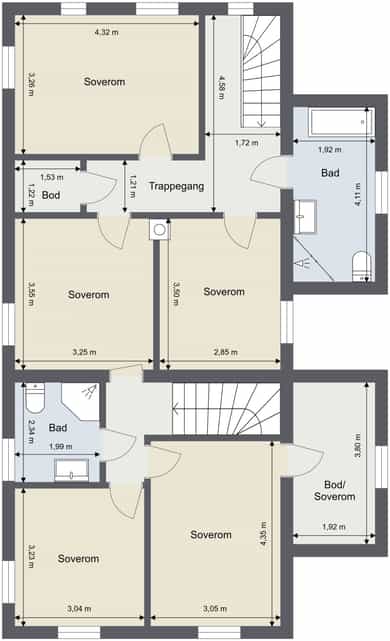 BRA-i: 99 kvm. Hoveddel: Trapperom, bod, bad og tre soverom.