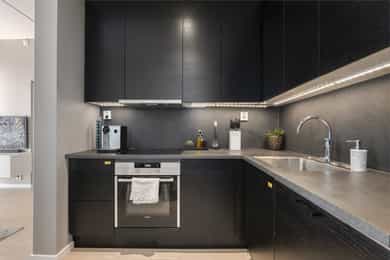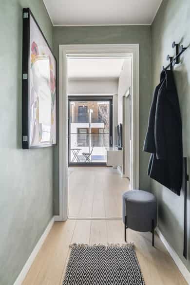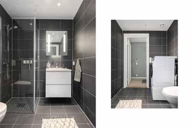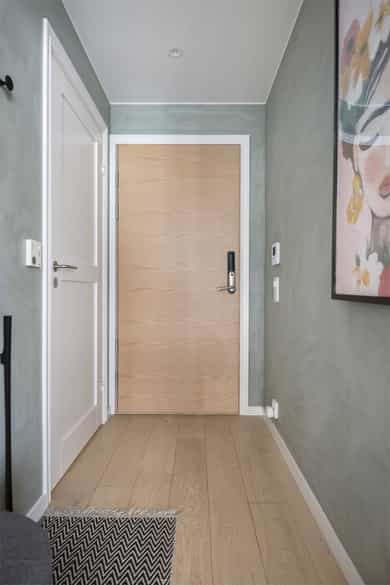 Entré: Leiligheten ligger i byggets 2. etasje med heisadkomst til leilighetsplanet. Når du kommer inn, møtes du av en innbydende entré som gir et godt førsteinntrykk. Veggene er malt i en lys og behagelig farge, og gulvet er dekket med pen parkett. Stue: Den lyse og hyggelige stuen har store vindusflater som sikrer gode lysforhold. Stuen og kjøkkenet er integrert i en åpen og sosial løsning, noe som skaper et innbydende oppholdsrom. Veggene er malt i en delikat og lys farge, og gulvet er dekket med flott parkett. Fra stuen er det utgang til en østvendt balkong på ca. 2m², med plass til sittegruppe. Kjøkken: Moderne kjøkkenløsning med slette fronter og laminat benkeplate. Kjøkkenet er utstyrt med integrert platetopp, stekeovn, oppvaskmaskin og kombinert kjøle- og fryseskap. Kjøkkenventilator er montert i overskapet med sentralt avtrekksanlegg i bygget. Bad: Lekkert bad med opplegg for vaskemaskin. Badet er utført med moderne og stilrene fliser samt behagelig gulvvarme. Innredningen består av en nedfelt servant med godt med skapplass, vegghengt toalett og et dusjhjørne med glassdører. Ventilasjonen skjer via et balansert anlegg, med lufttilførsel under døren. Soverom: Lunt og romslig soverom med god plass til dobbeltseng og tilhørende møblement. Store vinduer slipper inn naturlig lys, og rommet har en behagelig atmosfære med delikate vegger og pent parkettgulv. Innvendig overflater: Gulv har overflater av 1 stavs parkett, flis på bad. Vegger har overflater av malte plater, flis på bad.