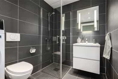 Boligbygg med flere boenheter - Byggeår: 2018 Bygningen er oppført i murverk og har fasader, leilighetsskilende vegger og etasjeskillere i betong og stål. De utvendige fasadene er synlig forblendet med fasadeplater. Bygningen har en flat takkonstruksjon tekket med takpapp. UTVENDIG - Boligen har malte trevinduer med 3-lags glass. Vinduene er beslått med aluminium utvendig. - Skyvebalkongdør i malt treverk med 3-lags glass, og brann- og lydklassifisert entrédør. - Balkong oppført i betong og stål orientert mot øst. - Det er lagt terressebord over dekket. Rekkverk i glass med forskriftsmessig høyde. - Balkongen er takoverbygget. - Balkongen er strukturell sikker og det er generelt lite slitasje på overflatene. INNVENDIG - Boligen har vedlikeholdsvennlige overflater med lav grad av slitasje. - Gulvene er belagt med laminat, og veggflatene er slette, malte. - Taket er også slett, malt. - Betongdekke utgjør etasjeskiller mot underliggende areal. Gulvet er ikke åpnet, og oppbygging er derfor ikke verifisert ved visuell kontroll; våre beskrivelser av konstruksjonens oppbygging må derfor betraktes som antakelser. Det er kun målt mindre høydeforskjeller i etasjeskille som ikke er til sjenanse for normal bruk av leiligheten. - Innvendig har boligen slette dører. - Dørene er montert riktig og har ingen synlige skader utover normal slitasje. - Skyvedører mot entrè og soverom. Glassdør inn mot innvendig bod. Følgende punkter har fått TG2 i tilstandsrapporten: Vannledninger Vurdering av avvik: • Rørkursene på rør-i-rør systemet på vannledninger er ikke merket. Konsekvens/tiltak • Rørkurser på rør-i-rør system bør merkes. Følgende punkter har fått TGIU (ikke undersøkt) i tilstandsrapporten: Tilliggende konstruksjoner våtrom Våtrom > Etasje > Bad/vaskerom > Tilliggende konstruksjoner våtrom