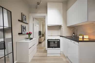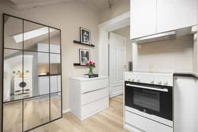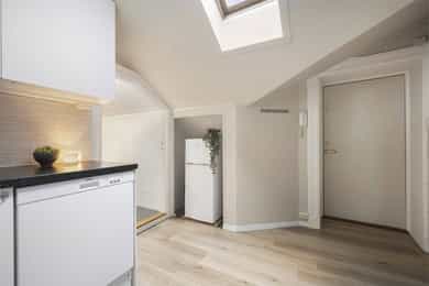 Lys, innbydende og arealeffektiv toppleilighet med supersentral beliggenhet på nedre Grünerløkka. Leiligheten ligger i en sidegate rett ved Akerselva. Du har kort vei til alt av byens fasiliteter, offentlig kommunikasjon, dagligvarebutikker, shopping, kafeer, barer, restauranter m.m. Planløsningen er optimal, og hver kvadratmeter er godt utnyttet. Leiligheten inneholder entré, separat kjøkken, stue og bad
