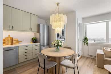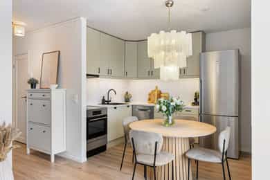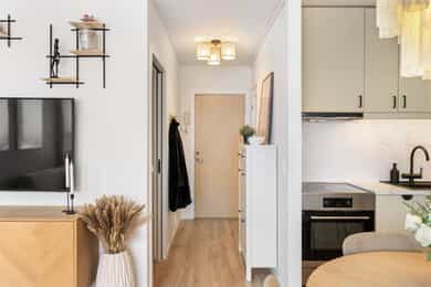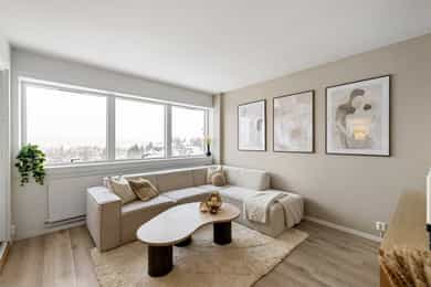 Lys og innbydende leilighet i byggets 9. etasje med heisadkomst. Leiligheten har en praktisk planløsning med åpen stue/kjøkken-løsning, alkove og bad. Oppholdsrommet er luftig og har utgang til innglasset balkong på ca. 6 m². Kjøkken og øvrige overflater er oppgradert i 2023/2024, og badet fremstår moderne etter oppussing i 2024. Det disponeres skap i kjeller, fellesvaskeri i bygget og det medfølger oppmerket parkeringsplass. Kort om eiendommen: - Arealeffektiv planløsning - Moderne kjøkken og bad - Heis - VV og fyring inkludert i felleskostnader - Kort vei til matbutikk, kollektivtransport og fritidstilbud - Perfekt førstegangskjøp - Ingen dok.avgift - Innglasset balkong med hyggelig utsyn - Høy beliggenhet med gode lysforhold - Egen parkeringsplass med mulighet for el-bil lader