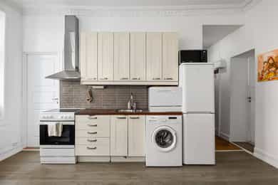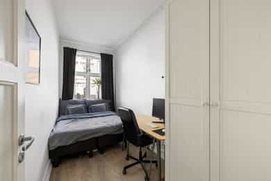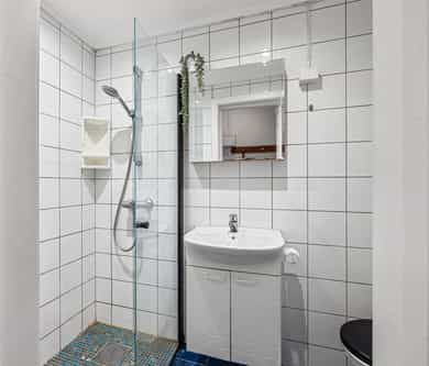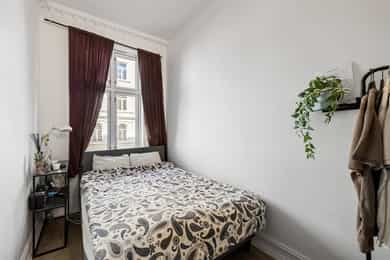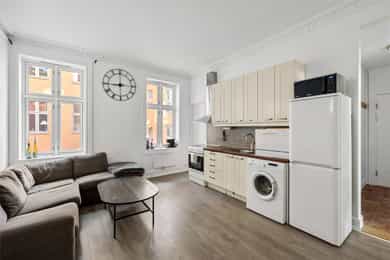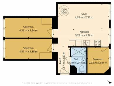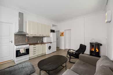 Entré En praktisk entré ønsker deg velkommen med fliser på gulv og dørcalling for enkel adkomst for gjester. Stue & Kjøkken: Hjertet i boligen er den åpne løsningen som preges av en luftig atmosfære og vakker, original stukkatur i himlingene. Veggene har en kombinasjon av malte glatte flater og tapet, mens gulvene består av laminat lagt over de originale tregulvene. I stuen er det montert en peis som gir lunt lys og varme på kalde kvelder. Kjøkkenet er praktisk innredet med profilert innredning og laminat benkeplate. Her er alt lagt til rette for en effektiv hverdag med plass til hvitevarer som kjøleskap/frys og stekeovn. Det er montert skylleplate mellom over- og underskap for enkelt renhold, og det er praktisk opplegg for vaskemaskin i kjøkkensonen. 3 Soverom: Leiligheten har hele tre soverom, noe som gjør den svært arealeffektiv. Den gode takhøyden bidrar til at rommene føles større enn kvadratmeterne tilsier. Baderom: Badet er helfliset og utstyrt med underskap, overskap og servant. Siden badet er av eldre dato, må det påregnes full oppussing og renovering for å møte dagens krav til standard. Dette gir deg imidlertid muligheten til å forme rommet nøyaktig slik du selv ønsker.