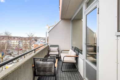 Solrik balkong på ca. 6 kvm med plass til sittegruppe