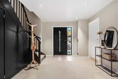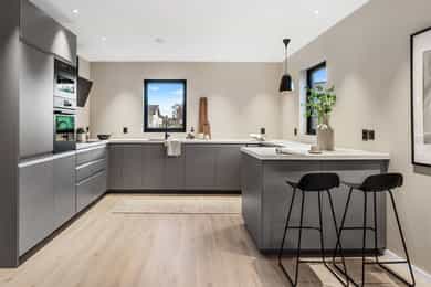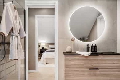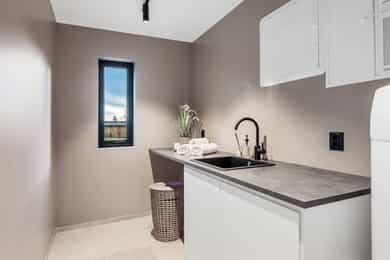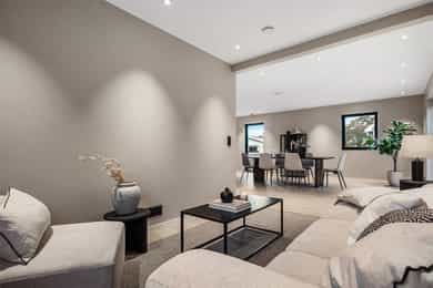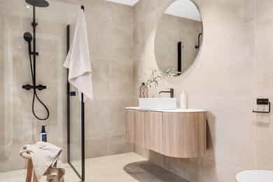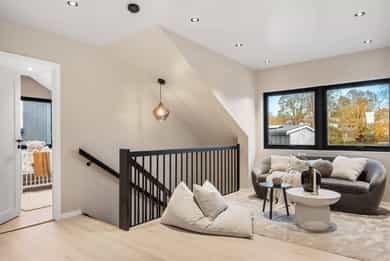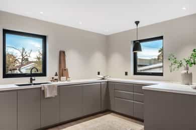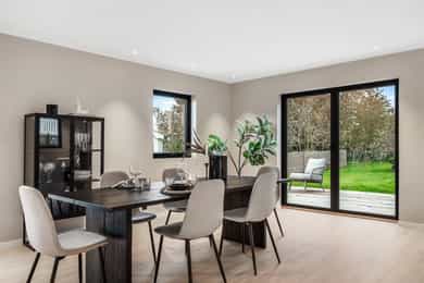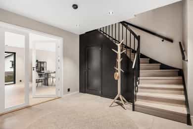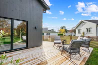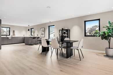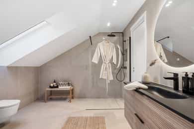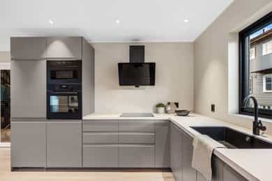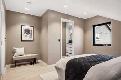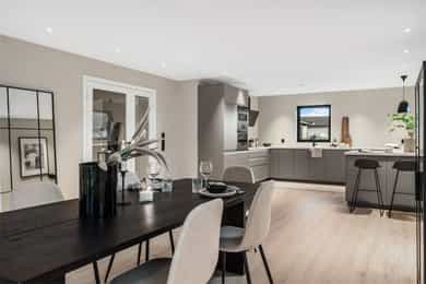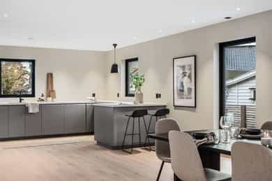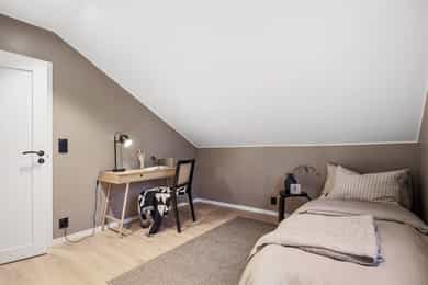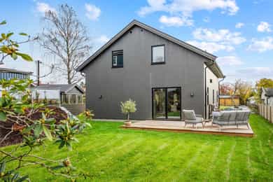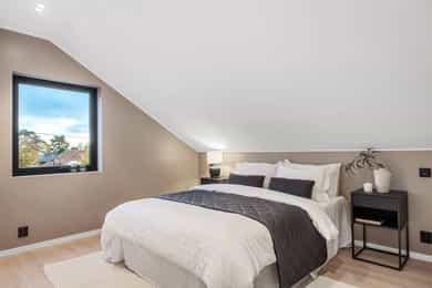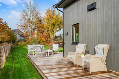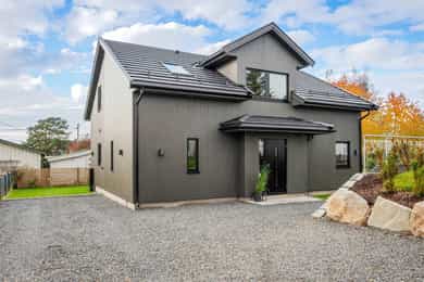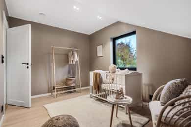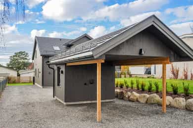 Velkommen til en moderne og innholdsrik familiebolig, bygget i 2025, med gjennomgående kvalitetsmaterialer, smarte løsninger og solrik terrasse. Boligen strekker seg over to plan med en funksjonell og familievennlig planløsning. Med 1-stavs laminatgulv med gulvvarme og tidsriktige fargetoner fremstår boligen lys og innbydende. Parkering gjøres på egen gårdsplass eller i carport. • 1. etasje: Inngangspartiet har støpt dekke som gir et innbydene førsteinntrykk. Vel innenfor døren møtes du av en romslig hall med flislagt gulv, downlights og lyse fargekombinasjoner. Den åpne trappeløsningen med sort rekkverk og kontrastvegg gir et stilsikkert førsteinntrykk. Her er det god plass til garderobe og en naturlig velkomstsone for både hverdag og gjester. En tofløyet glassdør leder videre inn til boligens hovedrom, en romslig og åpen stue- og kjøkkenløsning med store vinduer og utstrakt bruk av downlights. Helhetlige materialvalg og moderne fargetoner gir et elegant uttrykk, og det er gulvvarme i flere rom. Fra stuen er det utgang til en terrasse på 34 kvm som strekker seg rundt to sider av boligen - et flott sted å nyte gode solforhold og direkte tilgang til hagen. Kjøkkenet fremstår som både funksjonelt og stilrent, med slette fronter og lys laminat benkeplate. Den sorte underlimte komposittkummen harmonerer med øvrige detaljer, og halvøya gir ekstra arbeidsflate samt en naturlig overgang mot stuen. Hvitevarene inkluderer stekeovn, mikro, platetopp, oppvaskmaskin og kombiskap for kjøl/frys. Boligen har to gjennomførte bad med store fliser og sorte detaljer. Badet i første etasje har lyse 60x60-fliser, vegghengt toalett og servant i eik med tilhørende bolleservant. Det store runde speilet og de sorte armaturene gir et moderne uttrykk, mens dusjsonen har innfellbare glassdører og både hånd- og regndusj. Vaskerommet ligger vegg i vegg med badet og har en praktisk plassering rett ved inngangen, praktisk for småbarnsfamilien eller husets firbeinte. Rommet har flislagt gulv, god benkeplass og innredning med slette fronter, grå benkeplate og sort kum. • 2. etasje: En lukket trapp fører opp til en hyggelig loftstue, ypperlig som TV-stue, kontor eller lekerom for barna. Store vinduer gir godt lysinnslipp, og det er plass til både sofa og skrivepult. Det andre badet ligger praktisk til med adkomst både fra trapperommet og omkledningsrommet tilknyttet hovedsoverommet. Her videreføres det moderne uttrykket med fliser i 60x120-format, sort servant med tilhørende speil og vegghengt toalett. Dusjhjørnet er adskilt med glassvegg, har innebygd nisje, samt hånd- og takdusj i sort armatur. Takvindu og downlights gir rommet en lys følelse. Etasjen rommer også boligens tre soverom. Hovedsoverommet har plass til dobbeltseng med nattbord på hver side, og en skyvedør gir direkte adkomst til omkledningsrommet og videre inn til badet. Soverom to og tre er omtrent like store og egner seg godt som barne-, gjeste- eller arbeidsrom. På tegninger er det tegnet inn et fjerde soverom i første etasje, som enkelt kan bli soverom nummer fire. Boligen har gode oppbevaringsmuligheter med to innvendige boder og en utvendig bod på 6 kvm bak carporten. Innvendige overflater: - Vegger med slettmalte overflater med listfrie avslutninger/overganger - Gulv med laminat og fliser. - Slettmalte overflater i himling. Tekniske installasjoner: - Vannledninger i boligen utført i plast i rør-i-rør system. - Fordelerskap med etablert overløp til rom med sluk. - Plast avløp. - Boligen har etablert balansert ventilasjon. - Boligen er elektrisk oppvarmet. - Varmefordeling med gulvvarme i alle rom i begge etasjer, unntatt bod. - Flislagte gulv med varmekabler, øvrige gulv med varmefolie. - VV-bereder 200 liter, montert i rom med sluk. - Nytt el-anlegg 2025. - Røykvarslere montert, håndslukker tilgjengelig.