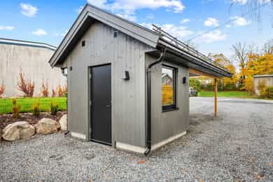 Gode parkeringsmuligheter på gruslagt gårdsplass eller i carport på egen tomt, hvor det også er en praktisk bod i enden av biloppstillingsplassen. I carporten er det montert elbillader som er tilkoblet til strømnettet.