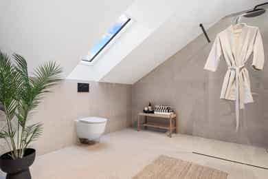 ENEBOLIG Utvendig: Taktekking: Saltak tekket med takstein. Nedløp og beslag: Renner og nedløp i stål. Montert snøfangere. Veggkonstruksjon: Yttervegger oppført i isolert bindingsverk. Fasader med vertikal trepanel med etablert luftespalte mot grunnmur. Takkonstruksjon/Loft: Saltak med innredet loftsetasje. Vinduer: Vinduer med ramme og karm i tre med 3-lags isolerglass. Skråtak i 2. etasje med takvinduer. Dører: Terrassedører, hhv. 1- og 2-fløyet, med ramme og karm i tre med 3-lags isolerglass. Balkonger, terrasser og rom under balkonger: Terrasse 34 kvm oppført med terrassebord på tilfarere/bjelker. Innvendig: Etasjeskille/gulv mot grunn: 1. etasje med støpt gulv på grunn, etasjeskiller oppført i trekonstruksjon med bjelkelag. Tomteforhold: Byggegrunn: Grunnmur fundamentert på komprimert bærelag. Det er ikke observert vesentlige sprekker som symptom på setninger. Grunnmur og fundamenter: Bolig oppført på ringmurselementer og støpt gulv på grunn. Utvendige vann- og avløpsledninger: Inntaksledning vann i plast, PEL-ledning. Pvc avløp. TG vurdert på bakgrunn av alder. BOD Bod oppført i trekonstruksjon, fasader med kledning tilsvarende boligen, støpt gulv på grunn. Saltak over bod og carport tekket med takstein, montert snøfangere. Gruslagt terreng i carport. I forbindelse med salget er det utarbeidet en tilstandsrapport for boligen som viser boligens tilstandsgrader, hvor TG1 er velfungerende forhold, TG2 er forhold som må påregnes utbedret på sikt, og TG3 er forhold som må påregnes utbedret omgående. TG2 - 1. etasje - Vaskerom - Overflater Gulv: Det er påvist andre avvik: Gulv med motfall ved sluk. Etablert fall fra dør til sluk. Montert lekkasjedetektor med automatisk vannstoppventil som reduserer risiko for skader. Krav ihht. TEK17; Lekkasjevann skal ledes til sluk. Dette betyr at det ferdig utførte våtromsgulvet skal være utformet uten motfall til sluk fra alle steder der det kan forekomme lekkasjevann. Konsekvens/tiltak: Manglende fall kan føre til at vann blir liggende på gulvet, noe som øker risikoen for fuktskader. -Redusert risiko ved montert lekkasjedetektor. - 2. etasje - Bad - Overflater Gulv: Det er påvist avvik i krav til høydeforskjell/fall-løsning på våtrommet. For dusjnisje ikke nedsenket 10mm er krav ihht. TEK17; Fall på minimum 1:50 til sluk i et område på minst 0,8 meter ut fra sluket. Målt fall i dusjnisje er 1:100. Konsekvens/tiltak: Til tross for avviket i fall/høydeforskjell til sluk, vil gulvet fortsatt kunne lede vann mot sluket, men med redusert effektivitet. Dette kan potensielt øke risikoen for vannansamling i enkelte områder av badet. Resterende forhold er kommentert med TG0 eller TG1, eller er ikke vurdert på tilstandsnivå. Hva ellers gjelder det tekniske om boligen og eiendommen generelt, henvises til tilstandsrapport og selgers egenerklæringsskjema som er vedlagt komplett i salgsoppgave. Det forutsettes at kjøper gjør seg kjent med disse før budgivning/kjøp.