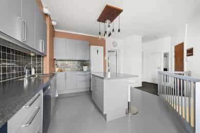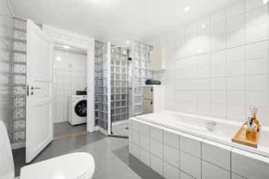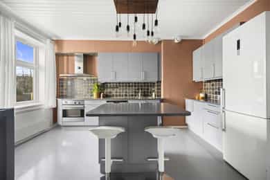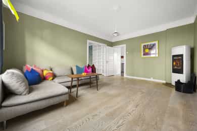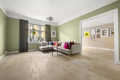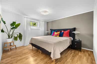 ENTRÉ: Velkommen inn! Leiligheten ønsker deg velkommen med en lys og innbydende entré med praktiske oppbevaringsløsninger. Det tidløse interiøret preges av varme, nøytrale farger som skaper en rolig og behagelig atmosfære. Planløsningen er fleksibel og gir rom for å sette ditt eget preg, samtidig som den gode standarden gjør at du kan flytte rett inn og trives fra første stund. 1. ETASJE: Boligen har en gjennomført planløsning som gjør hverdagen både praktisk og behagelig. I første etasje finner du en romslig stue og en egen spisestue - perfekt for familiemiddager, sosiale lag eller rolige kvelder hjemme. Et pent kjøkken med hyggelig utsikt og et separat wc gjør etasjen komplett og funksjonell. STUE OG SPISESTUE: Stuen i første etasje fremstår som lys, romslig og svært innbydende – et naturlig samlingspunkt for både familie og gjester. Store vindusflater og en takhøyde på hele 2,82 meter gir rommet en luftig og åpen følelse, mens de nøytrale fargene understreker det tidløse uttrykket. Kombinasjonen av parkett og malt tregulv gir et klassisk og elegant preg. En moderne peisovn med glassfront skaper varme og en hyggelig atmosfære på kjølige dager. Spisestuen ligger i åpen tilknytning til stuen, adskilt av en sjenerøs passasje som skaper en harmonisk overgang mellom oppholdsrommene. Rommet har god plass til langbord og byr på en fleksibel løsning som passer like godt til hverdagsmiddager som til sosiale sammenkomster. I henhold til tidligere byggetegninger er rommet opprinnelig byggemeldt som soverom, noe som gir flere bruksmuligheter. Stuen er malt i en dempet grønn tone som skaper en rolig og harmonisk stemning, mens spisestuen har en varm beige farge som tilfører rommet lunhet og karakter. KJØKKEN: Kjøkkenet har en eldre, men pent vedlikeholdt HTH-innredning med glatte, malte fronter og et tidløst uttrykk. Rommet oppleves som romslig og praktisk, med god skap- og benkeplass samt en funksjonell kjøkkenøy som skaper et sosialt samlingspunkt mellom kokk og gjester. Herfra har du utsyn mot det hyggelige gårdsrommet, som byr på frodige og grønne omgivelser i sommerhalvåret. Veggene er malt i en rustikk fargetone som tilfører varme og personlighet til rommet. Benkeplaten er i slitesterk laminat med nedfelt vaskekum, og over benken er det fliser med integrert belysning som gir både stil og funksjon. Kjøkkenet er godt utnyttet med takhøye overskap, integrert stekeovn og platetopp, samt kullfilterventilator over kokeplassen. WC: Et praktisk toalettrom, gunstig plassert like innenfor inngangsdøren i første etasje. Rommet har malte plater i himling og på vegger, kombinert med lekkert trepanel som tilfører varme og karakter. Flislagt gulv, vegghengt toalett og servant med innredning gir et rent og moderne uttrykk. Rommet har naturlig ventilasjon. U. ETASJE: I underetasjen finner du to romslige soverom, hvorav det ene har eget walk-in-closet. Etasjen rommer også et stort og funksjonelt baderom med integrert vaskeromsløsning, samt en praktisk innvendig bod med god lagringsplass. Her har du i tillegg egen inngang som leder ned til kjelleren, hvor leiligheten disponerer to tilhørende boder. SOVEROM 1: Rommet er romslig og vender mot det pene, opparbeidede gårdsrommet. Det benyttes i dag som soverom, men egner seg også godt som ekstra stue, kontor eller hobbyrom – alt etter behov. Rommet er byggemeldt og godkjent som kjellerstue, men ikke nødvendigvis godkjent for varig opphold. Overflater består av malte plater i himling og på vegger, samt gulv med en kombinasjon av parkett og fliser. Takhøyden er målt til 2,24 meter. Fra rommet er det adkomst til en praktisk bod under trappen med god lagringsplass. SOVEROM 2: Rommet benyttes i dag som boligens hovedsoverom, men er ifølge byggetegningene godkjent som hobbyrom og dermed ikke godkjent for varig opphold. Rommet har en generøs størrelse med plass til dobbeltseng, nattbord og øvrig møblering etter behov. Herfra har du direkte tilgang til et praktisk walk-in closet, som enkelt kan skjermes med skyvedør for en ryddig og funksjonell løsning. BADEROM + VASKEROM: Romslig og velutnyttet bad/vaskerom med flislagte vegger og gulv, samt elektrisk gulvvarme som gir behagelig komfort året rundt. Himlingen er utført med malte plater, noe som gir et rent og lyst uttrykk. Badet er funksjonelt innredet med klosett, servant på innredning, badekar og et separat dusjhjørne – en praktisk løsning som kombinerer både velvære og hverdagsfunksjon. Det er opplegg for vaskemaskin i rommet, som gjør klesvasken enkel og effektiv. Naturlig ventilasjon bidrar til et sunt og friskt inneklima. OPPBEVARING: 2 stk kjellerboder 1 stk loftsbod 1 innvendig bod Oppbevaringsplass under trapp ØVRIG INFORMASJON: Entrédør: Lyd- og brannklassifisert entrédør. Innerdører: Profilerte heltredører. Ventilasjon: Naturlig ventilering via lufteluker. Elektrisk anlegg: Automatsikringer. Oppvarming: Boligen varmes opp via elektrisk oppvarming og vedfyrt ovn, samt elektrisk gulvvarme i hele underetasjen. 1. etasje: Himlinger med malte plater. Vegger med malte plater. Gulv med malt tregulv og parkett. Takhøyden målt i stuen til: 2.82 m. Vinduer: Vinduer med trerammer og isolerglass, merket med produksjonsår 2004. Kjeller: Himlinger med malte plater. Vegger med malte plater. Gulv med parkett og fliser. Takhøyden målt i kjellerstuen til: 2.24 m. Vinduer: Vinduer med 2-lags isolerglass. prod. 1999. Varmtvannstank: Varmtvannstanken er på ca. 200 liter.