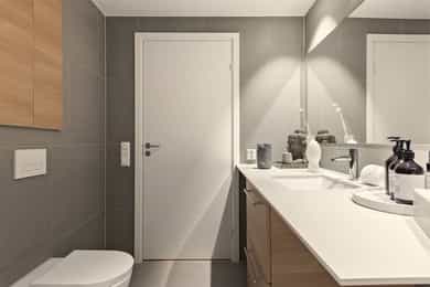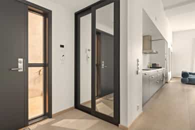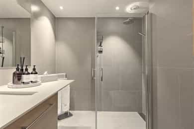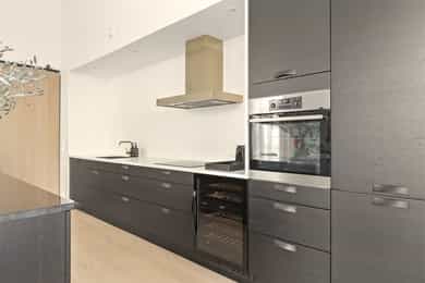 Entré Velkommen inn! Man ankommer boligen i en innbydende og romslig entré, med praktisk tilknytning til gjestetoalett. Her finner du en innebygget skyvedørsgarderobe med speilfronter - både stilfull og plassbesparende. Entreen gir et premium førsteinntrykk av boligen. Stue | Kjøkken Boligen har en åpen og luftig stue-/kjøkkenløsning med en imponerende takhøyde på 3,66 m. Romløsningen gjør det enkelt å dele inn i ulike soner, med stor sofagruppe og spisegruppe. Gulvene er av lekker eikeparkett, som gir et moderne og gjennomført uttrykk. Store vindusflater mot to himmelretninger gir rikelig med naturlig lys og en fantastisk romfølelse. Kjøkkenet fra HTH er stilrent og funksjonelt, med rikelig skap-, skuff- og benkeplass. Laminat og granitt benkeplate med nedfelt benkebeslag og ett-greps blandebatteri. Integrerte hvitevarer som kjøl/frys, oppvaskmaskin, ovn, kjøkken, induksjonstopp og mekanisk avtrekk fra ventilator med integrert komfyrvakt sørger for et sømløst uttrykk, og den store kjøkkenøya med barløsning fungerer som både samlingspunkt og ekstra arbeidsflate. Det er avtrekk via mekanisk avtrekksanlegg i boenheten. Leiligheten er unik med sin beliggenhet i 1.etasje, men med fjorden som strekker seg rundt leiligheten på utsiden. Det er derfor ingen gangareal utenfor akkurat denne leiligheten. Du har to private uteplasser: en vestvendt balkong på ca. 5 m² og sydvendte trinn på ca. 4 m² - perfekt for morgenkaffen. Totalt ca. 9 m² med private utearealer. Utebelysning, utekontakter og tilrettelagt strømuttak for varmelampe gjør dette til et uteområde du kan bruke store deler av året. Du kan til og med ankomme boligen med kajakk eller småbåt direkte fra vannet - en sjelden og eksklusiv mulighet! Soverom Leiligheten har to romslige og innbydende soverom, begge med egen baderomstilknytning. Master soverom har god plass til dobbeltseng, nattbord og garderobe. En egen mellomgang med potensial for hjemmekontor eller sminkebord leder videre til en praktisk innvendig bod - perfekt for ekstra oppbevaring. Soverom II er også romslig, med en skyvedørsgarderobe som dekker hele veggens bredde. Praktisk adkomst via skyvedør gir både funksjonalitet og et moderne uttrykk. Bad Leiligheten har to stilrene og moderne baderom, begge med privat adkomst fra hvert sitt soverom - en svært praktisk løsning som gir en suite-følelse. Begge badene er prefabrikkerte kabinbad og er helflisede med gulvvarme for en lun og behagelig opplevelse. Her finner du kvalitetsmaterialer, gjennomtenkt belysning og en moderne innredning. Bad I er utstyrt med heldekkende servant med underskap, speil med belysning, vegghengt toalett og dusjnisje med dusjvegger i herdet glass. Bad II har tilsvarende innredning og i tillegg opplegg for både vaskemaskin og tørketrommel - praktisk og plassbesparende. Begge badene har balansert ventilasjon som sikrer godt inneklima og effektiv fukttransport. Bod Boligen disponerer en romslig kjellerbod på ca. 8 kvm - ideell for oppbevaring av sesongutstyr, sportsutstyr eller annet man ikke bruker til daglig.
