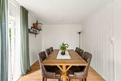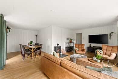 Nordvik eiendomsmegling v/ Hevin Güven har gleden av å presentere Storsvea 16! Velkommen til en koselig enebolig som byr på god plass, praktiske løsninger og fine uteområder. Her får du tre romslige soverom, et lyst og innbydende oppholdsrom med stue og spisestue i åpen løsning, samt et trivelig kjøkken med plass til spisebord. Fra stuen er det utgang til en solrik terrasse - perfekt for rolige morgenkaffer eller sosiale sammenkomster på varme sommerdager. I tillegg har boligen en romslig uinnredet kjeller med gode muligheter for videre innredning. Eiendommen ligger skjermet til, med en romslig tomt som gir godt med boltreplass for både barn og firbeinte. Her bor du i grønne omgivelser, men samtidig med nærhet til dagligvarebutikk, skole, barnehage og bussholdeplass.