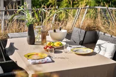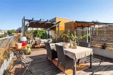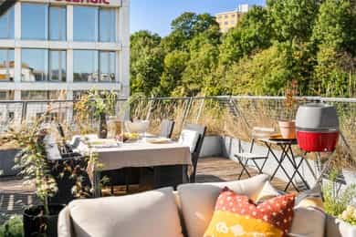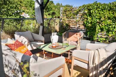 • Privat, vestvendt takterrasse på 38 m² med heisadkomst, kveldssol og rikelig plass til både loungesett og grill