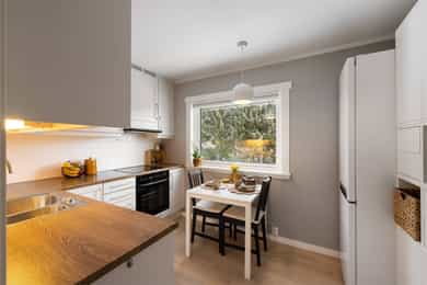 Entré: Velkommen inn! Boligen har en lys entré med plass til å henge fra seg yttertøy og sette fra seg sko. Det er stor garderobeløsning med mye lagringsplass. I tillegg disponeres to kjellerboder, samt et matskap. Stue: Stuen er av fin størrelse. Rommet har store vindusflater som slipper inn rikelig med naturlig lys. I tillegg er det åpen og uhindret utsyn mot omgivelsene. I stuen er det plass til sofaseksjon, tv-møbel og spisegruppe. Fra stuen er det utgang til en hyggelig balkong på 8 m². Her ute er det plass til sittegruppe, samt gass-/elektrisk grill. Balkongen er overbygget, og er vendt ut mot fellesarealer. Kjøkken: Kjøkkenet er separat, og byr på rikelig med benk- og skapplass. Innredningen har laminert benkeplate med nedfelt oppvaskkum og 1-greps blandebatteri. Det er fliser mellom over- og underskap. I tillegg er det montert en integrert oppvaskmaskin, integrert komfyr og nedfelt platetopp og det er tilkoblet en ventilator over kokeplassen. Det er plass til frittstående kjøleskap. Bad: Leilighetens bad har fliser på gulv og vegger. Innredningen består av et underskap/overskap, servant, speil, stikk og ett dusjkabinett. Videre er det opplegg for vaskemaskin og det er tilkoblet et vannklosett. Rommet har elstyrt vifte. To soverom: Boligen har to soverom. Hovedsoverommet har plass til dobbeltseng med tilhørende nattbord. Videre er det plass til klesoppbevaring i garderobeløsning. Soverom nr. 2 fungerer ypperlig som barnerom, gjesterom eller kontor - her er mulighetene mange. Rommet har plass til seng, nattbord, garderobeløsning og evt. skrivebord. Innvendige overflater: Gulv: Laminatgulv og tregulv. Vegger: Malte panelplater, malt panel, malte glatte flater og malt tegl. Himling: Malte glatte flater. For full oversikt over tilstandsgrader, se punktet Byggemåte eller se vedlagt tilstandsrapport.