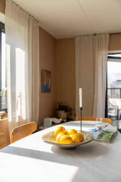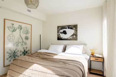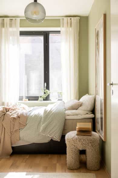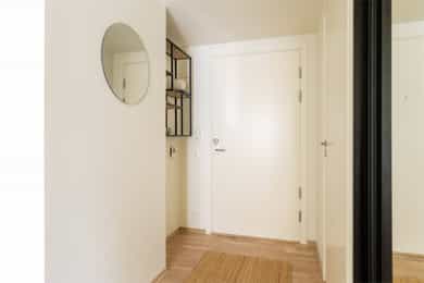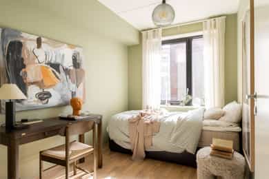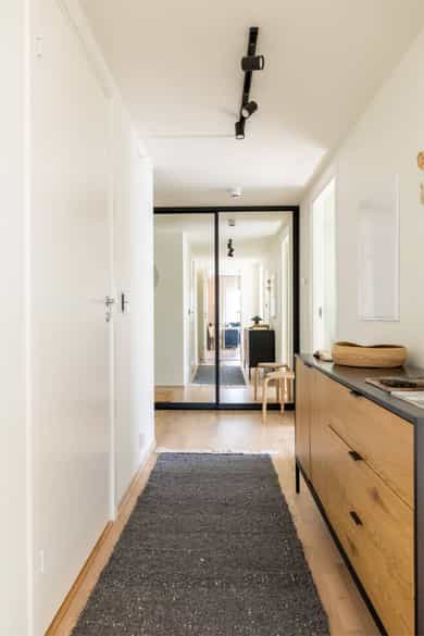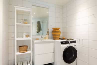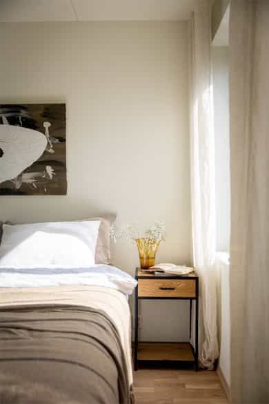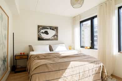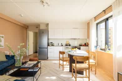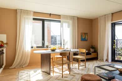 Entré: Velkommen inn! Du får et umiddelbart godt førsteinntrykk av leiligheten i den lyse og innbydende entréen. Det er plass til oppbevaring av sko og yttertøy med knagger, skohylle og skyvedørsgarderobe. Gangen har en sentral plassering i leiligheten, som sikrer god flyt mellom alle rommene. Åpen kjøkken- og stueløsning: Moderne og tidsriktig kjøkken fra byggeår. Stilsikker innredning med slette, hvite fronter og benkeplate i laminat. Integrert oppvaskkum med ettgreps blandebatteri. Kjøkkenet er utstyrt med integrert stekeovn og platetopp og avsatt plass til frittstående oppvaskmaskin og kjøleskap. Kjøkkenventilator med kullfilter over platetopp. Waterguard er installert for å beskytte mot vannskader iht. krav i TEK. Det er godt med både skap- og benkeplass, og god plass til matlaging. Ved kjøkkenet er det god plass til spisebord. Kjøkkenet og stuen har en herlig, åpen planløsning med store vindusflater, hjørneplassering og luftig atmosfære. Hjørneplasseringen sikrer godt lysinnslipp fra flere himmelretninger og naturlig lys gjennom hele dagen. Stuen har god plass til stor sofagruppe, sofabord og underholdningsavdeling. Leiligheten har stilrene overflater med eikeparkett og veggene er malt i en stilig og lun fargetone. Det er moderne fasiliteter som vannbåren gulvvarme og balansert ventilasjon som sørger for behagelig temperatur og inneklima hele året. Videre har stuen en planløsning som oppleves naturlig og gjør det enkelt å møblere, med flere gode innredningsalternativer. Fra stuen er det utgang til en balkong på ca. 9 kvm. På balkongen er det god plass til utemøblement, grill og beplanting. To soverom: Leiligheten har to gode soverom med adkomst fra gangen. Hovedsoverommet er romslig og har god plass til dobbeltseng, nattbord og garderobeskap. Rommet har to store vindusflater som gir godt innslipp av lys og luft. Soverom 2 egner seg godt som barnerom, gjesterom eller hjemmekontor. Rommet har plass til seng, skrivepult og skap/kommode. Bad: Badet er levert som et prefabrikkert baderomskabin fra 2022 med flislagte overflater. Badet har sanitærutstyr som består av veggmontert toalett, dusjhjørne vegg og dør i herdet glass og baderomsmøblement med servant, skuffer, speil og belysning. Balansert ventilasjon med avtrekksventil ved dusjsonen. Opplegg for vaskemaskin. Overflater: Gulv: Eikeparkett i oppholdsrom og fliser på badet. Det er vannbåren gulvvarme. Vegger: Malte, slette flater og fliser på badet. Himling: Malt himling.