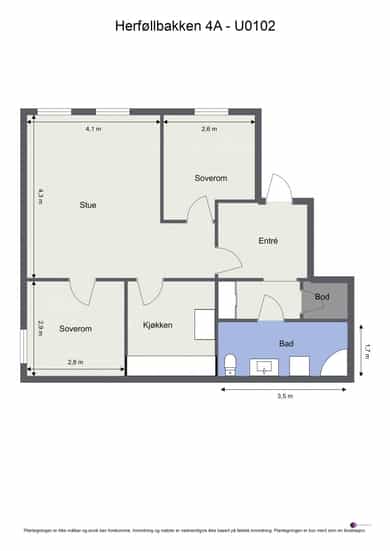 BRA-i: 63 kvm. Entré, gang, bod, stue, kjøkken, bad og 2 soverom.