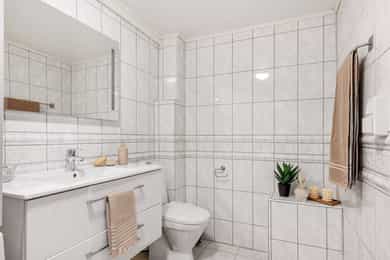 SELVEIERLEILIGHET UTVENDIG Vinduer med ramme og karm i tre med 2-lags isolerglass INNVENDIG Vegger med malt strie, himling med slettmalte overflater. Gulv med laminat. Sokkeletasje med støpt gulv på grunn. Radonmåling er ikke foretatt. TG2 - Radon: Radonmålinger er ikke foretatt, heller ikke andre tiltak mot radon, eiendommen ligger i et område som i NGU Radon aktsomhetskart er definert med "moderat til lav" aktsomhetsgrad. Konsekvens/tiltak: Det bør gjennomføres radonmålinger. Det er krav til dokumentert radonmåling ved utleie. - Bad, overflater gulv: Flislagt gulv, sluk under dusjkabinett. Det er mulighet for at det kan forekomme vannlekkasje på våtrommet hvor vann ikke vil gå til sluk. Det er påvist avvik i fallforhold til sluk i forhold til krav i forskrift på byggetidspunktet. Lokalt fall ved sluk, ca. 2/3 av gulvet med motfall. Konsekvens/tiltak: Et bad med manglende/redusert fall til sluk blir mindre funksjonelt og sikkert for brukeren. Dette kan medføre stående vann på gulvet, vann som ikke ledes effektivt til sluket, økt risiko for at vann renner ut av rommet og redusert sklisikkerhet på gulvet. - Bad, sluk, membran og tettesjikt: Plast-sluk med tilknyttet tettesjikt. Vurdering basert på alder. Tilstandsgrad 2 gis med bakgrunn i at mer enn halvparten av forventet brukstid for membran/tettesjikt er passert. Det er nå ingen symptomer på funksjonssvekkelse, men vær oppmerksom på at dette er en risikokonstruksjon. Konsekvens/tiltak: Det er viktig å merke seg at levetiden til en membran varierer basert på kvalitet, installasjon og bruk. Eldre membraner kan bli sprø og sprekke opp, noe som fører til at de mister sin vanntettende funksjon. Dette kan resultere i vannlekkasjer gjennom vegger og gulv og fuktskader. - Ventilasjon, bad: Mekanisk avtrekk. Det er påvist andre avvik: Baderommet mangler tilluft. Andre tiltak: Etablere tilluftsventil/-spalte. - Kjøkken, overflater og innredning: Skapinnredning med slette fronter, laminat benkeplate. Integrert oppvaskmaskin. Det er påvist andre avvik: Benkeplate med bruksslitasje og lokalt beskadiget. Andre tiltak: Event. utskifting benkeplate. - Vannledninger: Vannledninger i utførelse kobberrør. Vurdering er basert på alder. Tilstandsgrad 2 gis med bakgrunn i at mer enn halvparten av forventet brukstid for skjulte røranlegg er passert. Det er nå ingen symptomer på funksjonssvekkelse, men vær oppmerksom på at dette er en risikokonstruksjon. Konsekvens/tiltak: Det er ikke behov for utbedringstiltak siden anlegget fungerer i dag, men ut ifra alder kan skader plutselig oppstå på eldre anlegg. - Avløpsrør: Plast avløp, vurdering er basert på alder. Tilstandsgrad 2 gis med bakgrunn i at mer enn halvparten av forventet brukstid for skjulte røranlegg er passert. Det er nå ingen symptomer på funksjonssvekkelse, men vær oppmerksom på at dette er en risikokonstruksjon. Konsekvens/tiltak: Det er ikke behov for utbedringstiltak siden anlegget fungerer i dag, men ut ifra alder kan skader plutselig oppstå på eldre anlegg. - Varmtvannstank: VV-bereder, 28 liter, montert i benkeskap kjøkken. Fast el-tilknytning ihht. krav. Det er påvist andre avvik: Bereder i benkeskap uten lekkasjedetektor. Andre tiltak: Automatisk vannstoppventil anbefales montert. TG3 - Etasjeskille/gulv mot grunn. Sokkeletasje med støpt gulv på grunn. Målt høydeforskjell på over 30 mm gjennom hele rommet. Tilstandsgrad 3 gis med bakgrunn i standardens krav til godkjente måleavvik. Det er påvist andre avvik: Ujevnheter i undergulv. Andre tiltak: For å få tilstandsgrad 0 eller 1 må høydeforskjeller rettes opp. Det vil imidlertid sjelden være økonomisk rasjonelt som et enkeltstående tiltak i en bolig som dette. Dersom boligen en gang skal renoveres, kan man vurdere slike tiltak. Samtlige forhold er kommentert med TG0 eller TG1, eller er ikke vurdert på tilstandsnivå. Hva ellers gjelder det tekniske om boligen og eiendommen generelt, henvises til tilstandsrapport og selgers egenerklæringsskjema som er vedlagt komplett i salgsoppgave. Det forutsettes at kjøper gjør seg kjent med disse før budgivning/kjøp.
