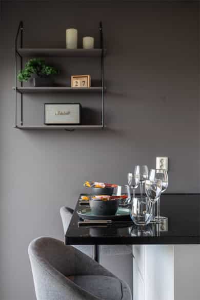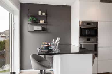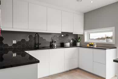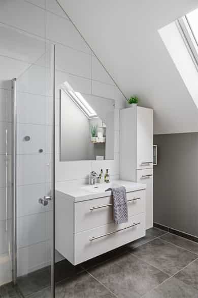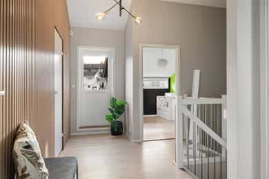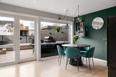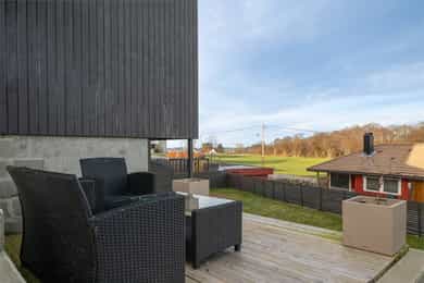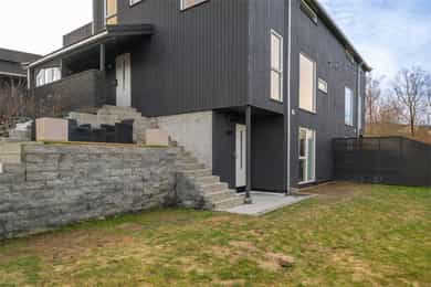 Boligen fremstår som moderne, lys og gjennomført med tidsriktige materialvalg og en funksjonell planløsning over 3 plan. Store vindusflater sørger for gode lysforhold, og innvendige overflater består hovedsakelig av laminat og fliser, med vegger malt i passende farger som skaper en helhetlig og innbydende atmosfære. Første etasje: I boligens hovedetasje finner man en gjennomtenkt og funksjonell planløsning med delikate overflater og rom som oppleves som praktiske og innbydende. Entréen ønsker deg velkommen med fliselagt gulv med varmekabler og naturlig plass til å henge fra seg yttertøy. Videre finner man et gjestetoalett, der det også er installert skyvedører for å ha ekstra garderobeplass på innsiden. Her er det blant annet opplegg for dusj om man ønsker å utvide badet og erstatte ekstra garderobeplass. Innerst i gangen finner man et soverom, med god plass til seng og garderobe, som av dagens eier er blitt brukt til lekerom. Et tidløst kjøkken med lyse, glatte overflater og en praktisk kjøkkenøy. Vinduer som slipper inn rikelig med naturlig lys, og utsikt mot sjøen. Boligens stue, fremstår luftig og med en behagelig atmosfære. Store vindusflater som slipper inn rikelig med dagslys med direkte utgang til en solrik terrasse som inviterer til avslappende stunder og hyggelige sommerdager. Andre etasje: Boligens andre etasje byr på 3 soverom og et bad. Ekstra takhøyde i hele etasjen gir en mer åpen og behagelig romfølelse. I gangen er det dør med utgang til en luftig balkong. Badet fremstår som moderne og stilrent, med fliser på gulv med varmekabler, dusj, servant med innredning og vegghengt toalett. I etasjen finner du hovedsoverommet med god plass til seng og oppbevaring. To ekstra gode soverom i øverste etasje, som gjør det boligen attraktiv for familier. Underetasje: I boligens underetasje kommer man til en bod som er innredet til flott spisestue. Rommet er ikke godkjent til varig opphold. Videre inn til et stort vaskerom som er smart utformet med fliser på gulv, opplegg for vaskemaskin, utslagsvask og lagringsplass. I tillegg finner man et tredje bad, med badekar og vegghengt toalett. Her også mulighet til å sette inn vask om det er ønskelig. I etasjen finner man også en stue som er innredet til et stort og funksjonelt treningsrom. Dette rommet har opplegg slik at man kan sette inn kjøkken og lage om til hybel i underetasjen. Gjennomgående er det benyttet kvalitetsmaterialer og moderne løsninger. Boligen har balansert ventilasjon, energieffektive vinduer og oppvarming med varmekabler i våtrom, i tillegg til solceller på taket som bidrar til reduserte strømkostnader og en mer energieffektiv bolig. Innvendig: Underetasje. Fliser og laminat på gulv. Malt vegg og tak. List-fritt mot tak. 1 Etasje. Fliser og laminat på gulv. Malt vegg og tak. List-fritt mot tak. 2 Etasje. Laminat på gulv. Malt vegg og tak. List-fritt mot tak. Tekniske installasjoner: Underetasje. Elektrisk. Varmekabler på gulv vaskerom og bad. 1 Etasje. Elektrisk. Varmekabler på gulv toalett og gang. Varmepumpe. Vedovn i stue. 2 Etasje. Elektrisk. Varmekabler på gulv bad.