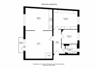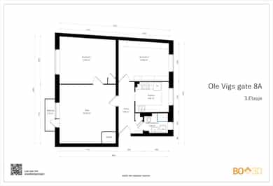 BRA-i: 75 kvm. Entré, bad, kjøkken, soverom, soverom 2, stue.