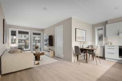 • Kort vei til strender, turområder, togstasjon og butikker Leiligheten har sentral beliggenhet på Glassverket på Jeløya, med gangavstand til hverdagslig aktivitet så vel som rekreasjonsmuligheter. Fra boligen er det et steinkast til blant annet Sjøbadet, Kanalparken, båthavn, kafeer, dagligvarebutikker og treningssentre.