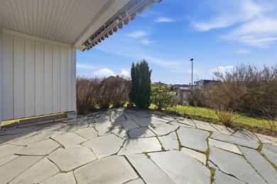 TBA i 1.etasje er en uteplass/veranda av skifer på terreng, og en veranda ved inngangspartiet.