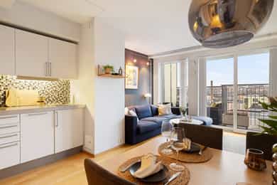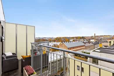 Velkommen til en lys og innbydende 2-roms i 7. etasje med heis og solrik balkong på ca. 8 kvm. Leiligheten har en praktisk og arealeffektiv planløsning med entré, stue med åpen kjøkkenløsning, bad og soverom, samt to boder hvorav en i samme etasje for ekstra lagring. Stuen oppleves luftig med store vindusflater, god plass til både sofagruppe og spisebord, og flott utsikt over byen. Kjøkkenet har glatte fronter og integrerte hvitevarer som gir et stilrent uttrykk. Soverommet har plass til dobbeltseng og garderobeløsning. Flislagt bad med varmekabler og opplegg for vaskemaskin. Vannbåren varme fra fjernvarme gir behagelig inneklima. Lave felleskostnader. I tillegg får du tilgang til byggets felles takterrasse, perfekt for sommerdager.