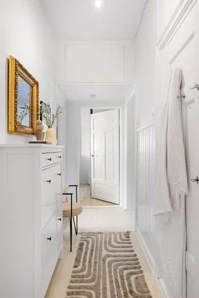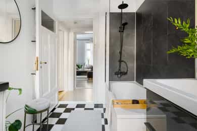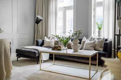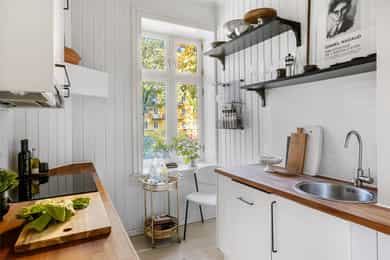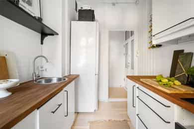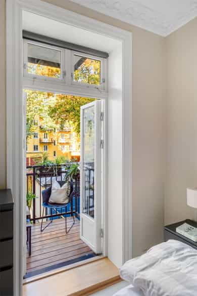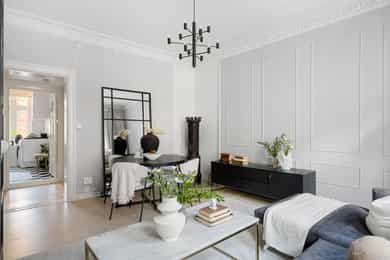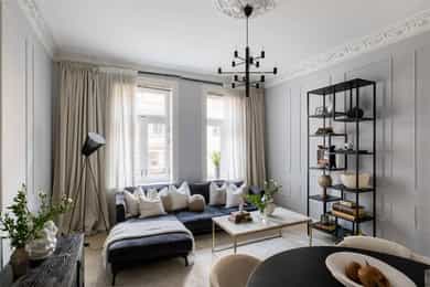 Leiligheten inneholder: Entré, kjøkken, bad, soverom og stue. Entré: Velkommen inn! Det første som møter deg i leiligheten er en lys og innbydende entré som gir et godt førsteinntrykk av boligen. Her er det god plass til sko og yttertøy. Stue: Lekker og lys stue med klassisk stil. Her får du pen enstavsparkett, stilige brystningslister på veggene, elegant peisovn samt rosett og stukkatur i taket. De klassiske detaljene, sammen med store vindusflater og generøs takhøyde, gir en svært god romfølelse og gode lysforhold. Stuen er lett å møblere, med god plass til både sofaseksjon og spiseplass. Kjøkken: Separat og pent kjøkken innredet med glatte, hvite fronter. God arbeidsplass på flott benkeplate i heltre med nedfelt vask- og skyllekum, samt rikelig med oppbevaringsplass i overskap. Kjøkkenet er innredet med integrert induksjonstopp, stekeovn og oppvaskmaskin. Praktisk belysning over benkeplaten, samt kullfilterventilator over koketopp. Bad: Romslig bad med flislagt gulv og elektrisk gulvvarme. Badet er innredet med klosett, servant med innredning, speil med lys og badekar. Her er det også godt med skapplass og opplegg for vaskemaskin. Stort vindu sørger for rikelig med naturlig lys. Soverom: Stort soverom vendt mot bakgård, med utgang til flott balkong. Soverommet har, i likhet med stuen, generøs takhøyde og klassiske detaljer. Fra balkongdøren kommer det rikelig med naturlig lys inn i soverommet. Her er det god plass til dobbeltseng, nattbord og stor garderobe. Balkong: Hyggelig og vestvendt balkong på ca. 3,6 kvm. Balkongen byr på frodig utsikt mot rolig bakgård og hage. Bod: Leiligheten disponerer en bod i kjeller på ca. 14 kvm, i tillegg til en bod på loft med skråtak. Loftsboden har en gulvflate på ca. 6 kvm. Innvendige overflater: Gulv - Enstavs parkett. Fliser med elektrisk gulvvarme på bad. Vegger - Malte plater. Malte plater og stålplater på bad. Tak - Malte plater med rosetter og stukkatur. Malte plater på bad. Takhøyden er målt til 2,96 meter i entré.
