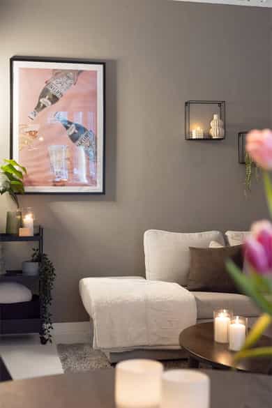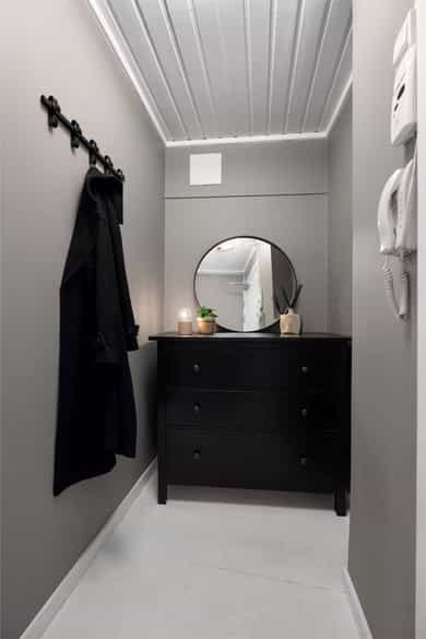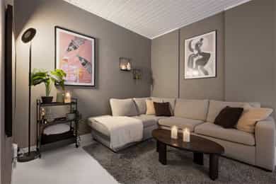 Entré / gang Velkommen inn i en praktisk entré med plass til å henge fra seg yttertøy og sette fra seg sko. Det er montert dørcalling til hoveddøren. Stue Videre inn i leiligheten kommer man til stuen. Stuen fremstår som lys og innbydende, med gode vindusflater som slipper inn rikelig med dagslys. Rommet har plass til både sofa- og spisegruppe, og gir fleksible møbleringsmuligheter. Malte gulvbord og lyse overflater skaper en lun og hyggelig atmosfære. Kjøkken Kjøkkenet ble oppgradert i 2020/2022 og har en moderne innredning med slette mørke fronter på underskap, frostet glass på overskap og laminert benkeplate. Her er det god skap- og benkeplass, samt praktiske løsninger for en effektiv hverdag. Kjøkkenventilator med kullfilter. Soverom Soverommet er romslig og har god plass til dobbeltseng med tilhørende nattbord og garderobeløsning. Bad Badet ble pusset opp i 2021 og fremstår moderne og velholdt. Det er flislagt gulv med varmekabler og fliser på vegg. Badet er utstyrt med vegghengt toalett, servant med underskap, dusjhjørne med innfellbare dører og opplegg for vaskemaskin. Det finnes også felles vaskeri i kjelleren. Bod Leiligheten disponerer kjellerbod for praktisk oppbevaring. --- BESKRIVELSE AV INNVENDIGE OVERFLATER (vegger, tak og gulv): Gulv: Fliser bad, øvrige rom rom malte gulv bord. Vegg: Fliser bad, øvrige rom malte flater, kalkmaling. Tak: Malte panel.