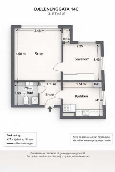 Dælenenggata 14 C byr på en tiltalende og pent oppusset 2-roms hjørneleilighet i byggets tredje etasje, med en attraktiv og sentral beliggenhet i et veldrevet borettslag. Leiligheten er et ideelt førstegangskjøp, hvor bla. v.vann og fyring er inkl. i fellesutgiftene. Boligen har en luftig og innbydende atmosfære med god takhøyde og en effektiv planløsning. Her får du et separat og moderne kjøkken, en stilfull stue med god takhøyde og plass til både sofagruppe og spisebord, samt et helfliset bad med dusjhjørne, oppgradert i regi av borettslaget i 2000. Soverommet er utstyrt med praktisk skyvedørsgarderobe, og boligen byr i tillegg på gode oppbevaringsmuligheter med nisje i stuen og to eksterne boder. Som beboer får du også glede av en hyggelig og pent opparbeidet bakgård.