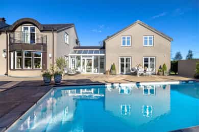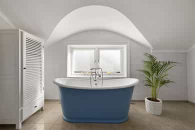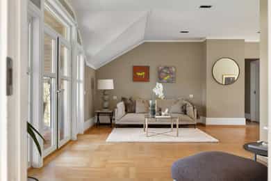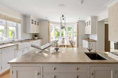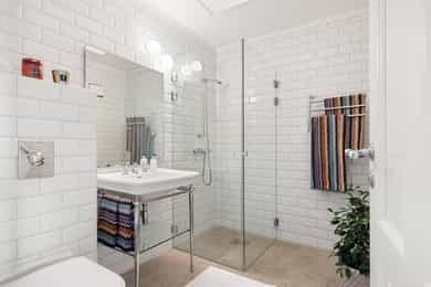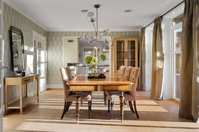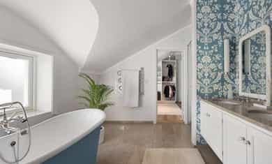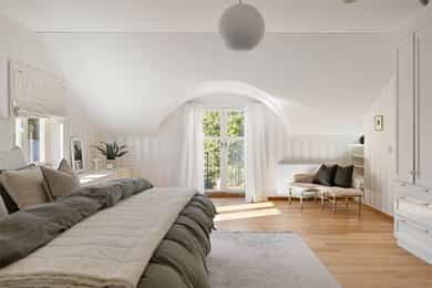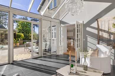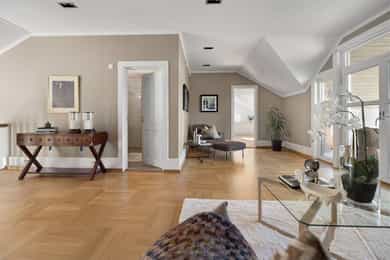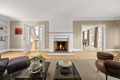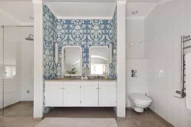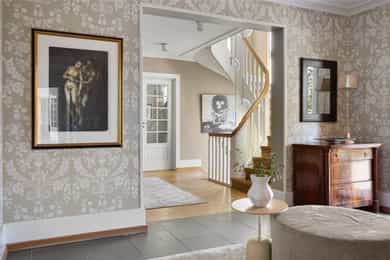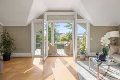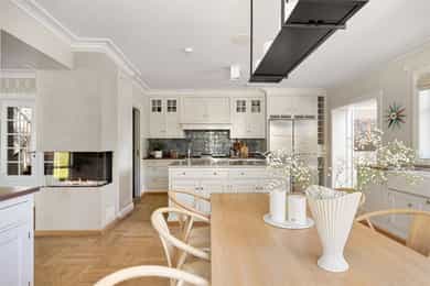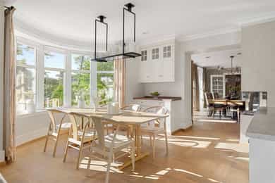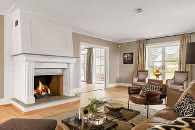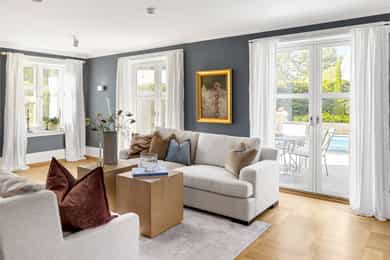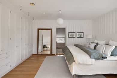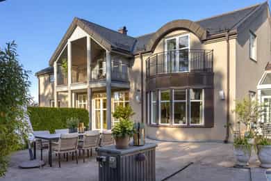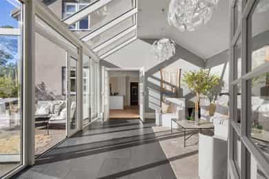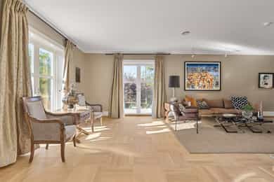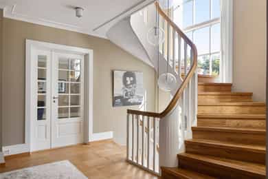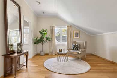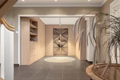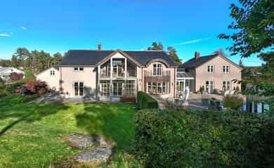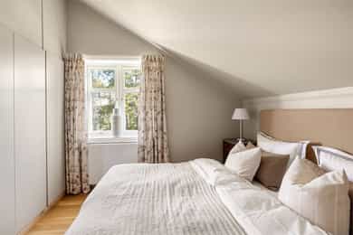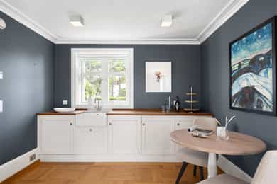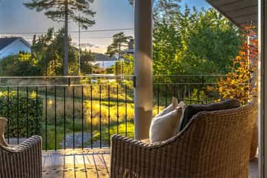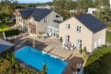 Denne praktfulle boligen har sprunget ut av en lidenskap for arkitektur og interiør. I de mange rommene møter vi så mye kvalitet og så mange utsøkte løsninger, at man blir helt målløs. Hallen ønsker velkommen med luft og takhøyde - et klassisk rom med ornamentert tapet, skifergulv og franske dører ut i stuen. Til siden ligger trapperommet, større enn de fleste stuer. Trappen følges av et to-etasjers vindu. Eiketrinnene svinger seg oppover med hvite fylllinger og rekkverk kronet med en elegant håndløper av eik, en mesterlig håndverk. Trappen forbinder to etasjer og underetasjen, som også er smakfullt innredet bl.a. med et lekkert vinlager, badeværelse og trimrom. Både hovedhuset og gjestehuset har fantastiske gulv. De flotte gulvene er heltre eik lagt i staver, og her går du lunt og godt - hele hovedetasjen og underetasjen har vannbåren gulvvarme. Veggene har gjennomgående lune toner, det være seg slettmalt eller tapet, mens listverk og tak er hvite. Når vi spaserer inn i vinterhagen som forbinder boligene, møter vi moderne renhet og store glassflater som åpnes opp mot kveldsluften, og klukkingen fra svømmebassenget. Det er forresten helautomatisk og kan benyttes til svømmeturer hele året. Kjøkkeninnredningen er levert av svenske Kvänum, som i et århundre har møblert både sommerhus, herregårder og slott. Skap og skuffer står i en ren, klassisk stil, perfekt tilpasset rommet. Hver minste detalj bekrefter den høye kvaliteten. Benkeplatene er av mørkebrun merbau, mens på den store kjøkkenøyen ligger lys steinplate. Stekeovnen fra italienske Ilve har gassbluss og holder profesjonell kvalitet. Fra kjøkkenbenken ser du ut i hagen, på bassenget, utestuen og trærne. Det buede karnappet med sine store vinduer liksom folder lyset rundt spiseplassen - et av boligens mest stemningsfulle rom, perfekt for familiefrokoster eller en liten espresso mens du leser lørdagsavisen. En åpen passasje leder oss ut i spisestuen. Den delikate tapeten, gasspeisen og langveggens heldekkende glassflater, gjør dette til et fantastisk rom å arrangere middagsselskaper, og er været riktig, åpner du dørene. Boligen har mange stuer. Trappen tar deg opp til en av dem, og her finner vi den deilige overbygde balkongen med utsikt mot Oslofjorden. Hovedsoverommet har sin egen buede balkong, og egen store garderobe. Innenfor ligger det luksuriøse hovedbadet - kledd i nøye utvalgte keramiske fliser fra Fired Earth og med en nydelig baderomsinnredning fra ekslusive Kensington Basin & Washstand. Badekaret står fritt ute på gulvet mot to vinduer. Du føler deg spesiell og godt ivaretatt på et slikt vakkert badeværelse. Boligen har totalt 4 bad og 5 soverom - alle med samme gode kvalitet og utførelse. Ved siden av alt det naturlige lyset har boligen et godt utvalg av dirigerbare spotter og downlights. Belysningen er designet av lyseksperter, og sørger for en funksjonell og stemningsfull atmosfære. Her finner du en bokvalitet langt utenom det vanlige. Balansert ventilasjonsanlegg sørger for et svært godt inneklima.