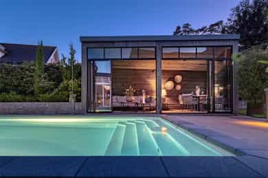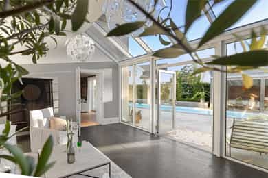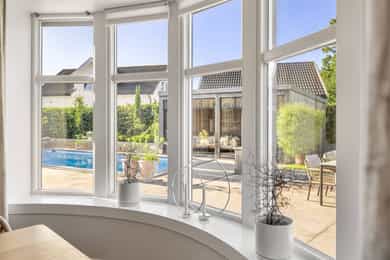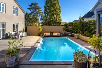 Et stort areal rundt og boligen er betongstøpt dekke. Dette dekket strekker seg bort til og rundt svømmebassenget og ender i en levegg mot naboen. Denne fantastiske uteplassen er dermed godt skjermet og privat. Bassenget er helautomatisk og av en slik størrelse at du kan få deg en god svømmetur. Vendt mot huset og bassenget finner vi en deilig utestue med mye glass og muligheter for å lukke og åpne som man vil - en av mange fantastiske uteplasser der du kan nyte tilværelsen.