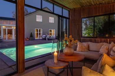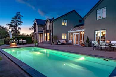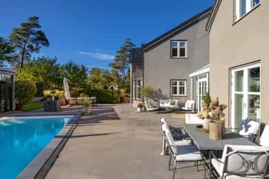 Praktvilla i skjærgårdsperlen Engelsviken. Nydelige rom med utsøkte detaljer. Stort svømmebasseng og flotte uteplasser.