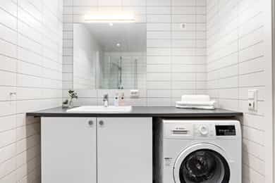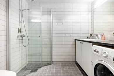 Innvendige overflater: Vegger: Slettmalt og fliser på bad Tak: Slettmalt og takplater på bad Gulv: Laminat og fliser på bad Kjøkken: Hvitt kjøkken fra 2019, type er ukjent. Malte slette vegger, malt slett himling og laminat på gulvet. Kjøkkenet har over og underskap, laminert benkeplate med nedfelt vask og platetopp. Integrert kombiskap (kjøl og frys), oppvaskmaskin og stekeovn. Ventilator tilkoblet ventilasjonsanlegg. Det er installert komfyrvakt og automatisk lekkasjesikring. Våtrom: Det opplyses om at badet er fra 2019 og er en prefabrikkert modul. Fliser på vegger og takplater i tak. Badet har servantinnredning med skaper og speil, opplegg for vaskemaskin, vegghengt toalett og dusj rett på flis med glassdører. Avtrekksventil i tak og spalte under dørblad for tilførsel av tilluft. Flislagt gulv med gulvvarme, sluk i dusj. Membranen er fra 2019. Plastsluk med vannlås, mansjett påvist klemt under klemring. Tekniske installasjoner: - Felles varmtvann for bebyggelsen. - Balansert ventilasjon. - Sikringsskap med automatsikringer plassert i gangen. Anlegget er skjult og det er totalt 9 kurser inkludert hovedsikring. - Varme via panelovner. Varmekabler på bad. - VVS anlegg bestående av rør-i-rør system med rørskap plassert i himling på bad, avløp og sluker i plast. - Lekkasjesikring er montert på kjøkken. Det er i forbindelse med salget utarbeidet en tilstandsrapport fra bygningssakkyndig. Tilstandsrapporten er en teknisk gjennomgang av boligen med oppdagede avvik. Forhold som har fått TG2 og TG3 må gjennomgås spesielt nøye, da disse indikerer avvik fra normal slitasje og/eller høy alder, med mulig behov for utbedring. Bygningsdeler som har fått TGIU er ikke undersøkt av takstmann. Bygningsdeler som har fått TG2: - VVS - WC og innvendige vann- og avløpsrør Tilstandsvurdering: -Vegghengt toalett på badet har ingen spalte for synliggjøring av eventuell lekkasje. Dokumentasjon for hvordan denne er bygget inn eller hvilken produkttype som er brukt er heller ikke fremlagt. Toalettet ble installert etter krav til synliggjøring av lekkasje og krav til dokumentasjon. Dokumentasjon må innhentes Bygningsdeler som har fått TG3: - Ingen. Bygningsdeler som ikke er undersøkt (TGIU): - Varmtvannsbereder Beskrivelse: Felles varmtvann for bebyggelsen, ingen bereder i leiligheten. Tilstandsrapport for boligen er vedlagt salgsoppgaven. Se denne for nærmere informasjon om tilstandsgrad.
