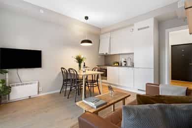 2.etasje, 35 kvm BRA-I: Gang, bad, stue, kjøkken og soverom. Leiligheten disponerer én bod i kjeller (nr. A22) på ca. 3 kvm. Entré Velkommen inn! I leiligheten blir du møtt av en innbydende entré med garderobeskap som gir god plass til sko og yttertøy. Stue Lys stue med åpen løsning mellom stue og kjøkken og god plass til både sofagruppe og spisebord. Pene overflater bestående av laminatgulv og veggflater malt i tidsriktig farge. Stuen har store vindusflater som sørger for godt med naturlig lys og skaper en luftig atmosfære. Kjøkken Pen og stilren kjøkkeninnredning fra 2019 med over- og underskap, laminert benkeplate med nedfelt vask og platetopp. Kjøkkenet er utstyrt med integrerte hvitevarer som kombiskap, oppvaskmaskin, stekeovn og platetopp med ventilator tilkoblet ventilasjonsanlegg. Bad Delikat og moderne bad fra 2019 bestående av flislagt gulv med varmekabler, flislagte vegger og malte plater i himlingen. Innredningen består av servant med skap og speil. Videre er badet utstyrt med vegghengt toalett, dusj med glassdører samt opplegg for vaskemaskin. Det er varmekabler i gulvet. Soverom Leilighetens soverom er av god størrelse med god plass til dobbeltseng, nattbord og tilhørende soveromsmøblement.