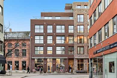 Bygningen er oppført i 2019. Bebyggelsen er et kombinert næring- og boligbygg som er fordelt på 4 og 6 etasjer med kjeller. På bakkeplan er det næringslokaler, leiligheter fra 2 etasje og oppover. Bygningsmassen er oppført med bærende konstruksjoner i betong og stål. Utvendig er fasader er forblendet med teglstein og taket er tekket med papp eller lignende. Den aktuelle leiligheten ligger i 2.etasje og har adkomst via heis eller felles trappeoppgang. Vinduer og dører: Vinduer med 3-lags glass i PVC. Vinduer er av type fastkarm og 2-veis åpning med luftestilling og det registreres datostempling fra 2018. Ytterdør i brannklasse EI30.