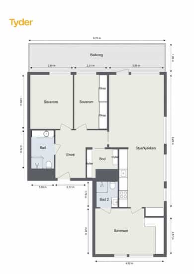 BRA-i: 93 kvm. Entré, bod, to bad, tre soverom og stue/kjøkken.
