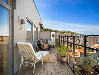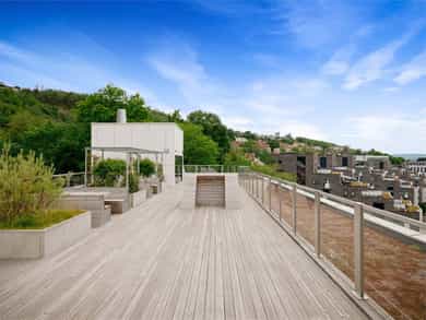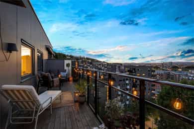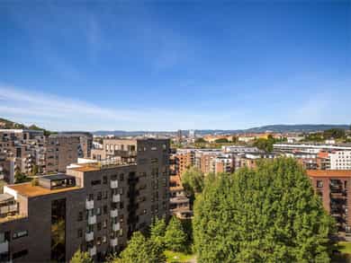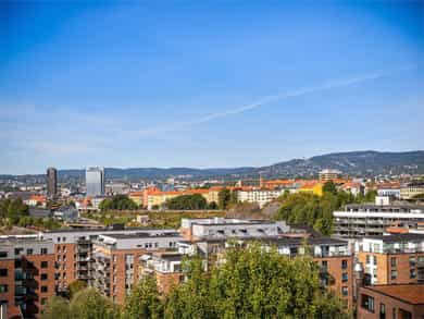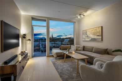 Lys og lekker toppleilighet med høy standard og gjennomtenkt planløsning. Her bor man i toppetasjen med fantastisk panoramautsikt og en vestvendt balkong på hele 19 kvm med svært gode solforhold. Leiligheten stod ferdig i 2019 og ble ytterligere modernisert i 2021. Bygget har heis, og du får tilgang til tre flotte takterrasser. Tørrskodd garasjeplass medfølger. Svært attraktiv beliggenhet, med alle fasiliteter i umiddelbar nærhet! Høydepunkter: - Heis - Garasjeplass - Solrik, vestvendt balkong på 19 kvm - Spektakulær utsikt over Oslo by - Gjennomgående planløsning - 3 gode soverom - 2 bad - Enstavs parkett - 3 felles takterrasser - Ved innfrielse av andel fellesgjeld vil felleskostnader utgjøre kr. 7 067,- pr. mnd. - A konto fyring, varmtvann og internett inkl.