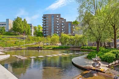 Leiligheten ligger i et svært populært boligområde i Kværnerbyen. Bydelen er bygd på Kværner Bruks gamle tomt og har en sentral beliggenhet med kort avstand til Gamlebyen og Grønland, samt Bjørvika, der Operaen og Oslos nye finansdistrikt allerede er etablert. Herfra er det også kort avstand til populære Sørenga med en rekke serveringssteder og Sørenga sjøbad. Det meste av det du trenger i hverdagen er på plass i Kværnerbyen. Her kan du kjøpe dagligvarer på Kiwi eller Nærbutikken, gå til frisøren, neglesalongen, trene på treningssenter og handle på apoteket. Nabolaget består av fine grøntområder med vannspeil og frodige bakgårder med flere sitteplasser. Kroloftet/ Kruttverket med 2 badstuer fra Oslo Badstuforening er åpnet i Arnljot Gellines vei. Bar og flere gratis aktiviteter som jazzkonsert hver søndag. En rekke parker og fine rekreasjonsområder ligger i gangavstand. Langs Alnaelva kan man gå inn mot Svartdalen med fl otte skogsområder for både turgåere og mosjonister. Fra Akerselva er det også tur- og sykkelstier helt opp til Maridalsvannet. Eller hva med å ta turen opp kjærlighetsstien til Ekebergrestauranten og nyte utsikten over Oslo? Det er også kort vei til Østmarka og de flotte turområdene man finner der. Det er kort vei til treningssenter og idrettshall, samt Jordal sportspark med bl.a. fotballbane, skøytehall, amerikansk fotball og skateanlegg m.m.