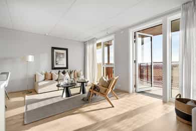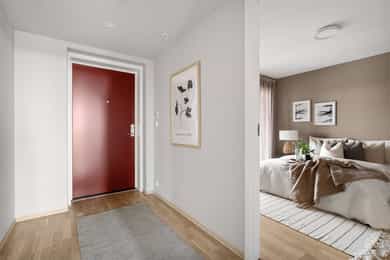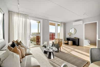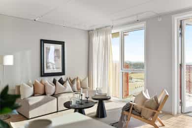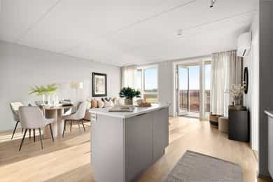 Andelsleilighet med formidabel utsikt fra både stue og balkong. Leiligheten har en romslig stue og kjøkken i åpen løsning, delikat flsilagt bad og to soverom hvor det ene har direkte tilkomst til innvendig bod som kan benyttes som walk in closet. - Kjøkken og bad levert av kvalitetsleverandøren HTH - Delikat helfliset bad med varmekabler - Vannbåren gulvvarme i stue/kjøkken - Balansert ventilasjon med varmegjenvinning - God romhøyde - Fast parkeringsplass og sportsbod (5 kvm) - Treningsrom og bilvaskehall - Felles takterrasse med gode solforhold Madla Vest er et Madla Pluss-konsept med delingsordninger. Her har du tilgang til selskapslokale med trivselsvert, gjestehybel, treningsrom, bilvaskehall og flott takterrasse. Ved nedbetalt andel fellesgjeld er felleskostnader kr 2 494,- per mnd.