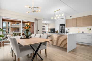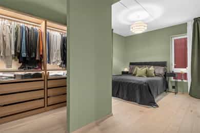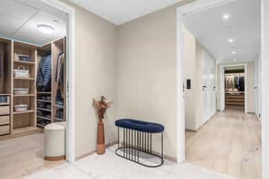 2. etasje, 118 m² BRA-I: Entré, omkledningsrom, kjøkken, spisestue, stue, 3 soverom, 2 bad, vaskerom. Leiligheten disponerer én sportsbod (bod nr. 10) i kjeller på ca. 5 m². Biloppstillingsplass i garasjeanlegg med elbillader. Entré Pent flislagt entré med behagelig vannbåren gulvvarme, som er gjennomgående i leiligheten. Fra entréen er det adkomst til romslig walk-in closet, som gir god plass til sko og yttertøy. Stue Stue med god plass til sittegruppe og TV-møbel. Fra stuen er det utgang til fransk balkong. Store vindusflater fra flere sider gir flott lysinnslipp. Stuen og øvrige oppholdsrom har flott enstavs eikeparkett. Spisestue/kjøkken Sosial løsning med kjøkken og spisestue. Her har du god kontakt med middagsgjestene fra kjøkkenet både i hverdagen og ved sosiale sammenkomster. Stilrent og moderne HTH-kjøkken med benkeplater i komposittstein og Siemens hvitevarer. Betydelig oppgradert fra standardleveranse. Kjøkkenet er blant annet utstyrt med fullsize kjøleskap, stekeovn med pyrolyse, kompaktovn med mikro, oppvaskmaskin, induksjonstopp, fullsize fryseskap og høyskap med tandem uttrekk. Induksjonstopp med benkeventilator på kjøkkenøyen. Tapwell armatur med uttrekksfunksjon og underlimt Blanco komposittvask. Kjøkkenøyen har waterfall benkeplate, nedfelt strømuttak på begge sider, barløsning med plass til to stoler samt skuffer og skap på hele siden som vender mot spisestuen. I spisestuen er det god plass til stort spisebord. Store vinduer, utgang til fransk balkong og store skyvedører til balkongen sørger for godt med naturlig lysinnslipp. Fra spisestuen og balkongen er det flott og åpent utsyn uten innsyn mot Nansenparken og Storøya kunstgress. Elektrisk solskjerming med screens på alle vinduer mot øst og vest. Balkong Overbygget vestvendt hjørnebalkong på 13 m² med god plass til utemøbler og grill. Her kan man nyte fantastiske solforhold og flott utsyn mot Nansenparken mot nordvest med solnedgang midtsommers. Balkongen har også utebelysning og to strømuttak. Hovedsoverom med walk-in og en suite bad Romslig hovedsoverom med walk-in closet med åpen garderobeinnredning. God plass til dobbeltseng og nattbord. Svært stille og rolig, helt uten biltrafikk. Her kan man også nyte flott utsikt fra sengekanten. Bad ved hovedsoverommet Delikat flislagt baderom tilknyttet hovedsoverommet med servant og skuffer med god benkeplass, speil, dusjhjørne med glassdører, Tapwell armatur med regndusj og hånddusj, Tile Insert linjesluk og vegghengt wc med innebygget sisterne. Varmekabler i gulv. Soverom II Soverom med garderobeskap. Rommet er 2,17 meter bredt og har plass til seng på tvers. Østvendt mot bakgård. Soverom III Soverom med stor hjørnegarderobe samt god plass til dobbeltseng og skrivebord. Østvendt mot bakgård. Bad II Delikat flislagt bad II med adkomst fra gangen. Badet inneholder servant, speil, dusjhjørne med glassdører, Tapwell armatur med regndusj og hånddusj, Tile Insert linjesluk og vegghengt wc med innebygget sisterne. Praktisk separat vaskerom Svært praktisk separat vaskerom med adkomst fra gangen. Rommet har flislagt gulv, benk og skapplass.
