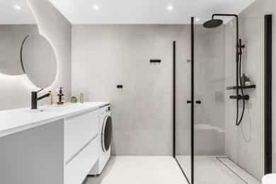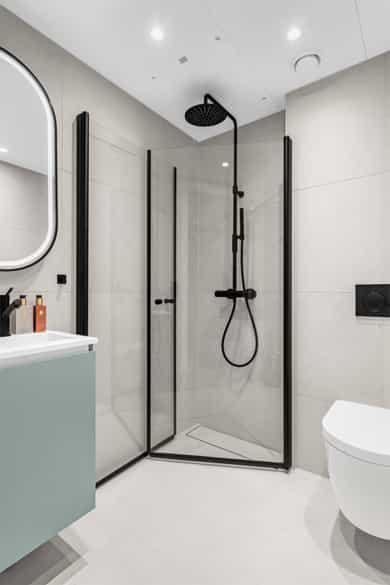 Innvendige overflater: Gulv: Fliser i entré, bad og vaskerom. Parkettgulv i øvrige rom. Vegger: Fliser på bad og sokkelfliser på vaskerom. Ellers malte overflater. Himling: Malte plater i himling på bad. Ellers malte overflater. Takhøyden er målt til 260 cm i stuen. Dører: Profilerte enspeils hvitmalte innerdører med massiv kjerne. Kjøkken: Kjøkkeninnredning med slette fronter og benkeplate med nedfelt koketopp og oppvaskkum. Under kjøkkenbenken er det installert magnetventil/lekkasjesikring. Denne vil fungere forebyggende og kutte vanntilførselen om det skulle oppstå en lekkasje fra kjøkkenet. Stekeovn, kombiovn, kjøleskap og oppvaskmaskin er integrert i innredningen. Våtrom: Hovedbad: Flislagt gulv med gulvvarme. Gulvet tilfredsstiller dagens krav om fall mot sluk. Rennesluk i plast i dusjsonen. Flislagte vegger. Malte plater i himling med downlights. Badet er utstyrt med vegghengt toalett, dusjhjørne, servantskap med blandebatteri. Mekanisk avtrekk. Hulltaking er ikke utført ettersom badet er nytt (innenfor 5 års garantitid) og det er fremlagt tilstrekkelig dokumentasjon for utført arbeid. Det er foretatt fuktmåling / fuktsøk i overflater fra tilstøtende rom mot våtsone på våtrommet. Undersøkelsen viser ingen tegn til fukt. Gjestebad: Flislagt gulv med gulvvarme. Gulvet tilfredsstiller dagens krav om fall mot sluk. Rennesluk i plast i dusjsonen. Flislagte vegger. Malte plater i himling med downlights. Badet er utstyrt med vegghengt toalett, dusjhjørne, servantskap med blandebatteri. Det er opplegg for vaskemaskin. Mekanisk avtrekk. Hulltaking er ikke utført ettersom badet er nytt (innenfor 5 års garantitid) og det er fremlagt tilstrekkelig dokumentasjon for utført arbeid. Det er foretatt fuktmåling / fuktsøk i overflater fra tilstøtende rom mot våtsone på våtrommet. Undersøkelsen viser ingen tegn til fukt. Tekniske installasjoner: - Soilrør av støpejern. Innvendige avløpsrør av plast. - Vannledninger med rør-i-rør system. - Fordelerskap i vegg over toalett har rørfordeling til vannbåren varme, vannmåler og hovedstoppekran. Fordelerskap i himlingen på hovedbadet inneholder røropplegg til bad/kjøkken/vaskerom og har stoppekraner. - Sikringsskap med automatssikringer plassert i omkledningsrommet ved entré. Digital strømmåler og hovedsikring er plassert i fellesareal. - Vannbåren gulvvarme i leiligheten. - Balansert ventilasjonsanlegg med ventilasjonsaggregat plassert bak skapdører ved vaskerom. Oppholdsrommene har tilluft og avtrekk. Det er i forbindelse med salget utarbeidet en tilstandsrapport fra bygningssakkyndig. Tilstandsrapporten er en teknisk gjennomgang av boligen med oppdagede avvik. Forhold som har fått TG2 og TG3 må gjennomgås spesielt nøye, da disse indikerer avvik fra normal slitasje og/eller høy alder, med mulig behov for utbedring. Bygningsdeler som har fått TGIU er ikke undersøkt av takstmann. Boligbygget og leiligheten ble oppført i 2024 og samtlige bygningsdeler har fått TG1 eller TG0. Tilstandsrapport for boligen er vedlagt salgsoppgaven. Se denne for nærmere informasjon om tilstandsgrad.